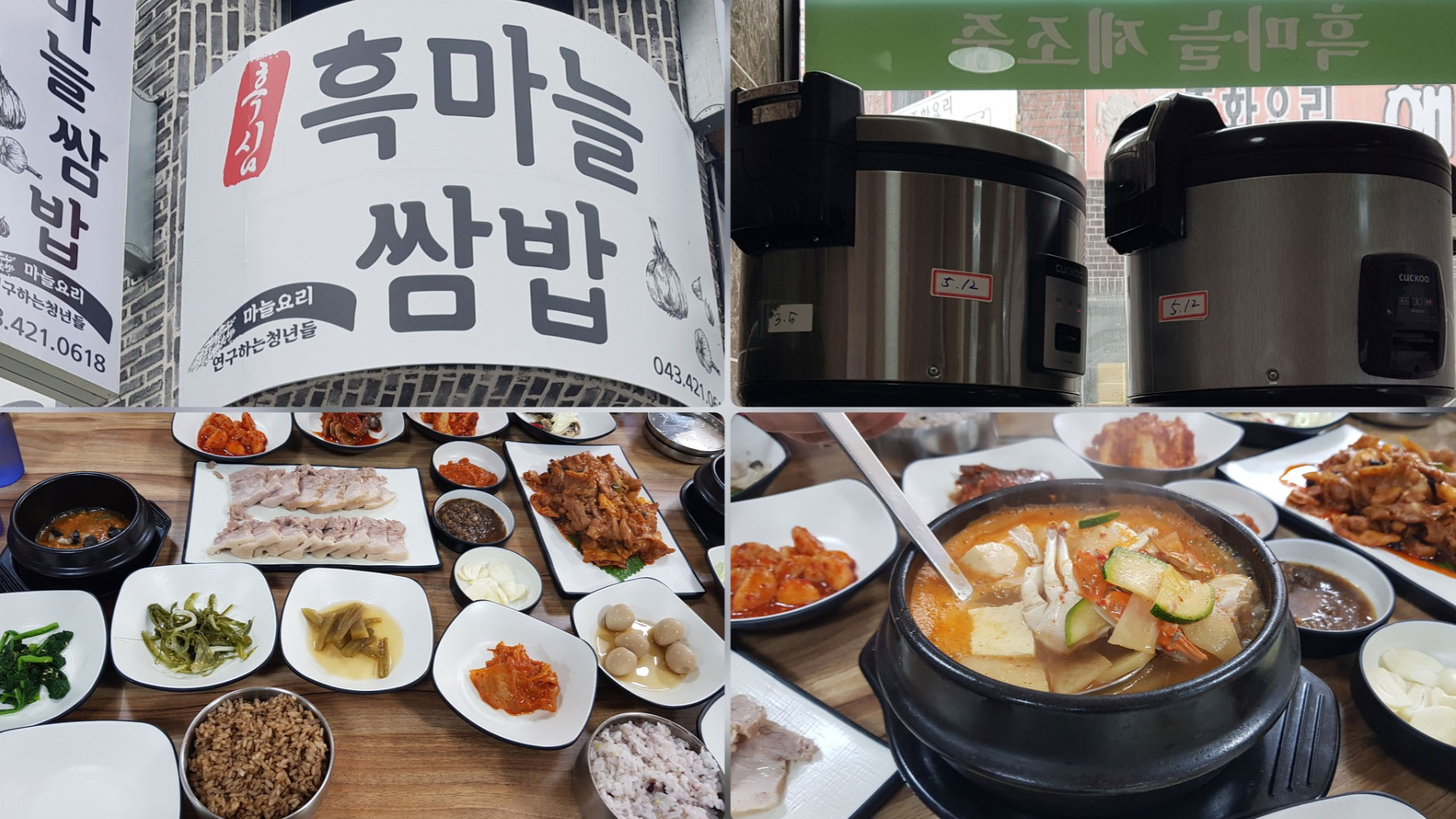 단양구경시장 근처에 있는 단양 흑마늘 쌈밥은 제육과 수육이 나오는 쌈밥 단일 메뉴와 입구에 흑마늘을 숙성시키는 공간이 있어서 그런지 믿음이 가는 식당입니다. 정갈한 반찬과 우렁강된장, 꽃게된장찌개, 제육과 수육, 그리고 흑마늘 밥이 잘 어우러지는데요. 마늘향이 강하지 않아 아이들도 거부감 없이 먹을 수 있어 가족 단위로 많이 찾는 맛집입니다.