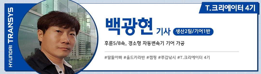 안녕하세요, 저는 생산2팀/기어1반에서 근무 중인 T.크리에이터 4기 백광현 기사입니다. 저는 전국 곳곳으로 캠핑 다니는 것을 좋아하는 자칭 올드카라반 캠퍼인데요. 작년 5월에는 카라반 캠퍼들의 버킷 리스트 중 하나인 제주 카라반 캠핑을 다녀올 만큼 열정적으로 캠핑을 즐기고 있습니다.