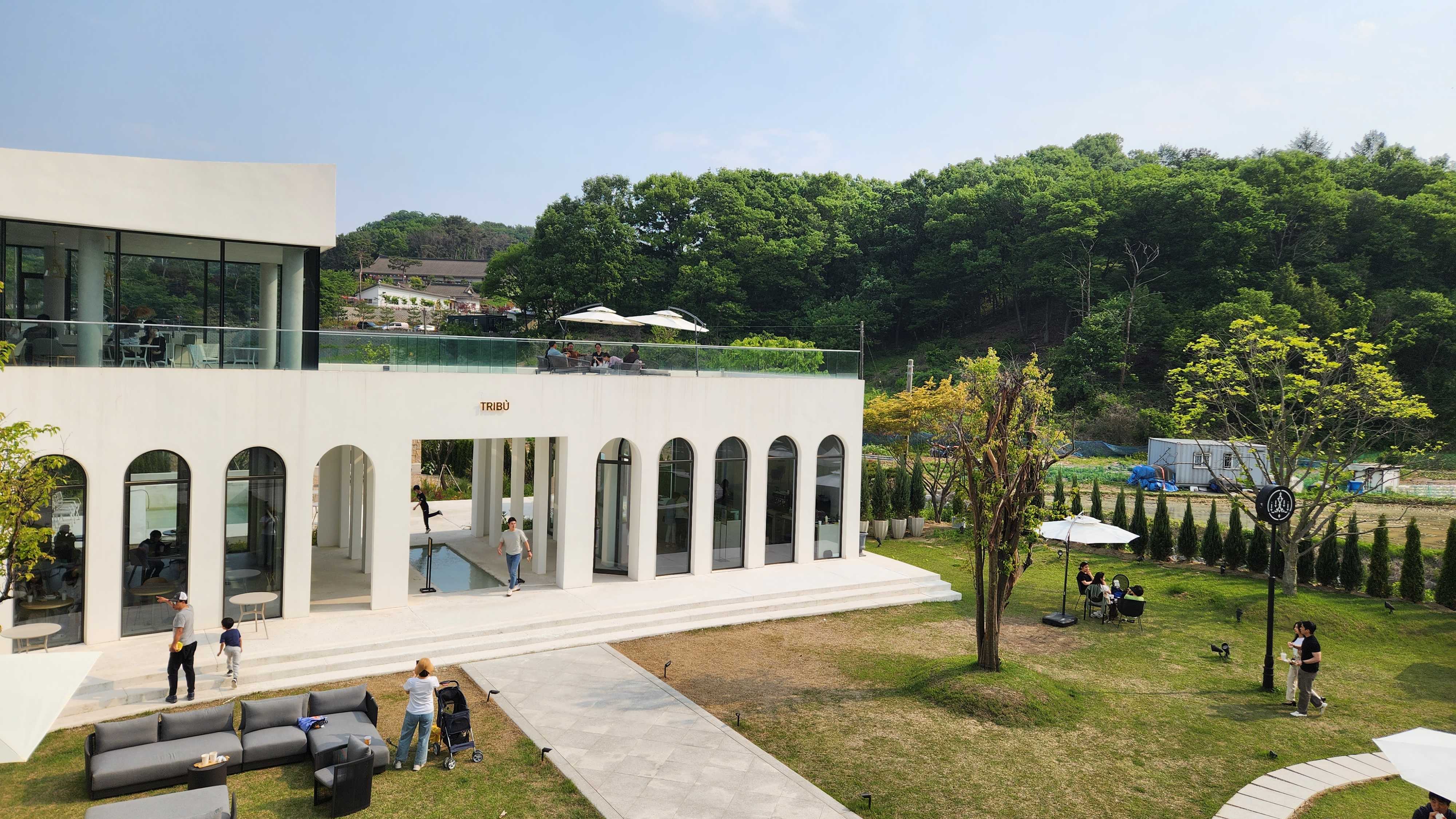 입구를 들어서면 가장 먼저 푸른 잔디가 펼쳐져 있고, 그 앞으로 카페 건물이 자리잡고 있는데요. 요즘처럼 날씨가 좋은 날에는 야외에서 즐기는 걸 추천 드립니다. 하지만 너무 더울 땐 실내도 쾌적하고 예쁘답니다.