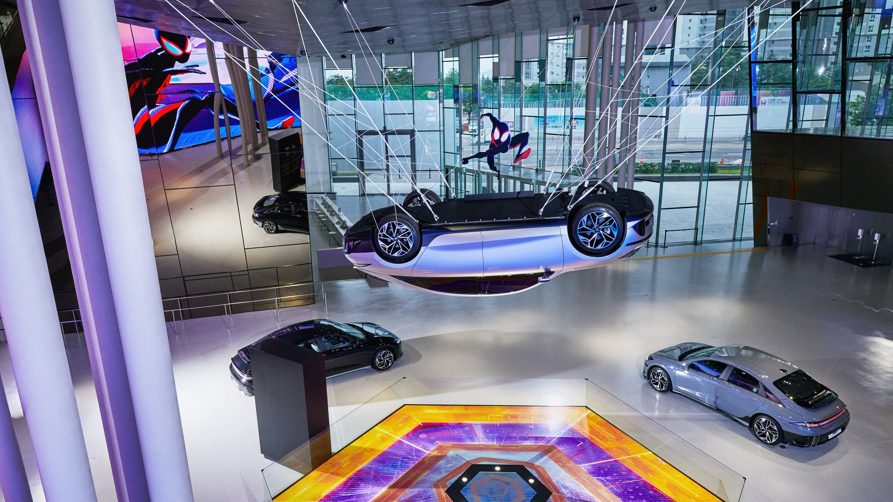한편 현대차는 8월 말까지 현대 모터스튜디오 고양에서 스파이더맨 테마의 기획 전시를 운영하고 있는데요. 전시 공간에는 스파이더맨 거미줄에 매달린 아이오닉 6와 함께 영화 속 다차원 우주 공간인 멀티버스로 문을 형상화 한 전시물이 설치되어 있습니다.