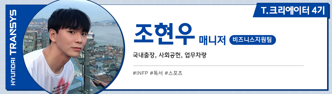 안녕하세요, 현대트랜시스 비즈니스지원팀에서 근무하고 있는 T.크리에이터 4기 조현우 매니저입니다. 사회생활을 처음 시작했을 때, ‘책임’이라는 직급이 다소 생소하게 느껴졌습니다. 사전적 의미로 책임은 맡아서 해야 할 임무나 의무 또는 어떤 일에 관련되어 그 결과에 대하여 지는 의무나 부담을 뜻하고 있는데요.