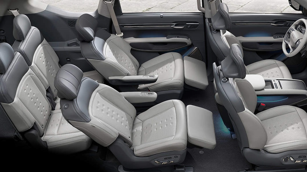 독립시트는 2열이 별도의 독립된 좌석으로 구성되어 2-2-2 레이아웃을 갖는 구조입니다. 시트에 암레스트가 적용되고, 하나의 좌석을 온전히 누릴 수 있다는 것이 최대 장점이죠. 보통 1명의 어린 자녀를 케어 해야 하는 가족, 또는 청소년 이상의 자녀가 2명 이상인 경우 많이 선택합니다. 독립시트는 2WD의 에어, 어스 트림에서 선택 가능합니다.