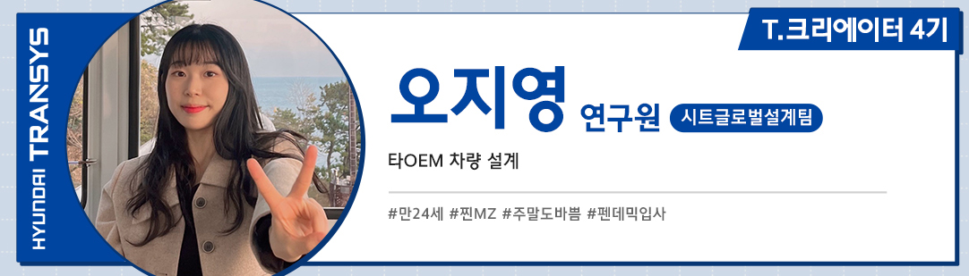 안녕하세요, 현대트랜시스 시트글로벌설계팀에서 근무하고 있는 T.크리에이터 4기 오지영 연구원입니다.