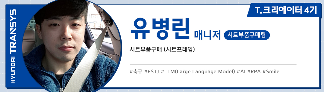 안녕하세요, 현대트랜시스 시트부품구매팀에서 근무하고 있는 T.크리에이터 4기 유병린 매니저입니다. 대규모 언어 모델(LLM)을 기반으로 하고 있는 챗GPT가 세간의 화제입니다. AI에 의해 대체되느냐, AI를 활용하느냐는 순간의 선택이 될 것 같은데요.