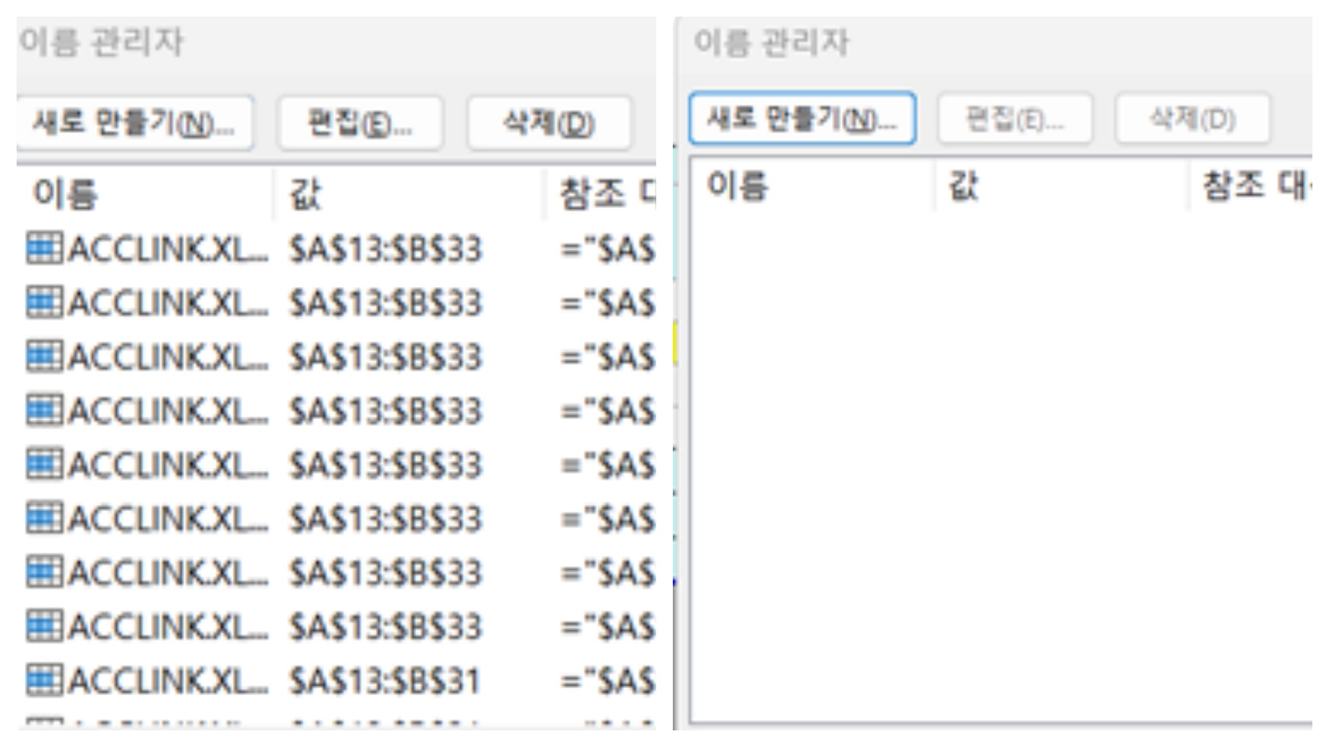 정리가 되지 않은 이름관리자 에러는 엑셀 속도 저하의 주범이 됩니다.
