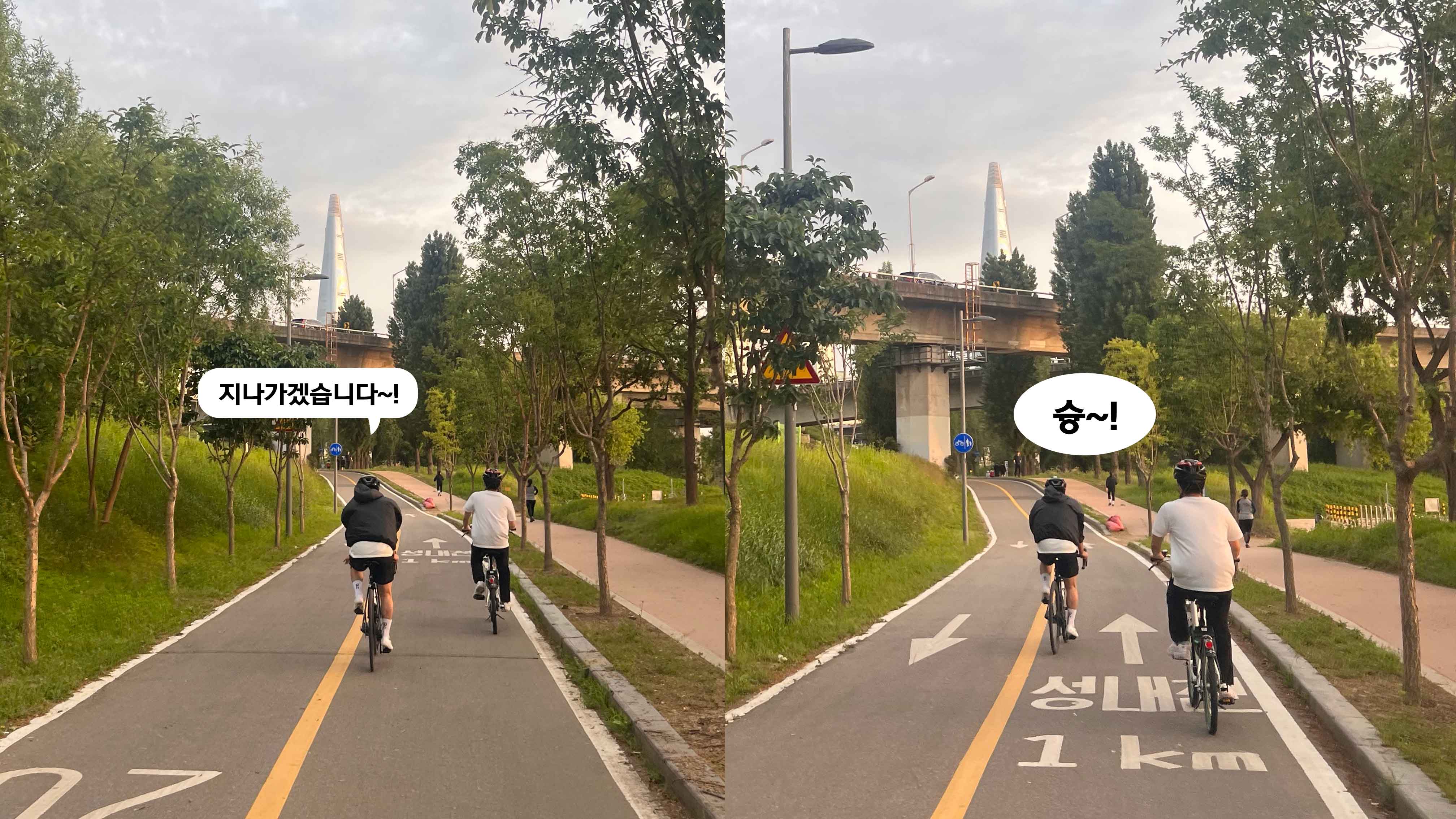 바로 상대방이 확실히 내가 지나간다는 것을 알 수 있도록 “지나가겠습니다!”라고 외친 뒤 지나가시면 되는데요. 그래도 혹시 상대방이 이어폰을 끼고 있거나 알아차리지 못하는 경우가 있을 수도 있기 때문에 추월하는 순간에도 조심히 지나가셔야 한다는 점! 꼭 명심하기실 바랍니다.