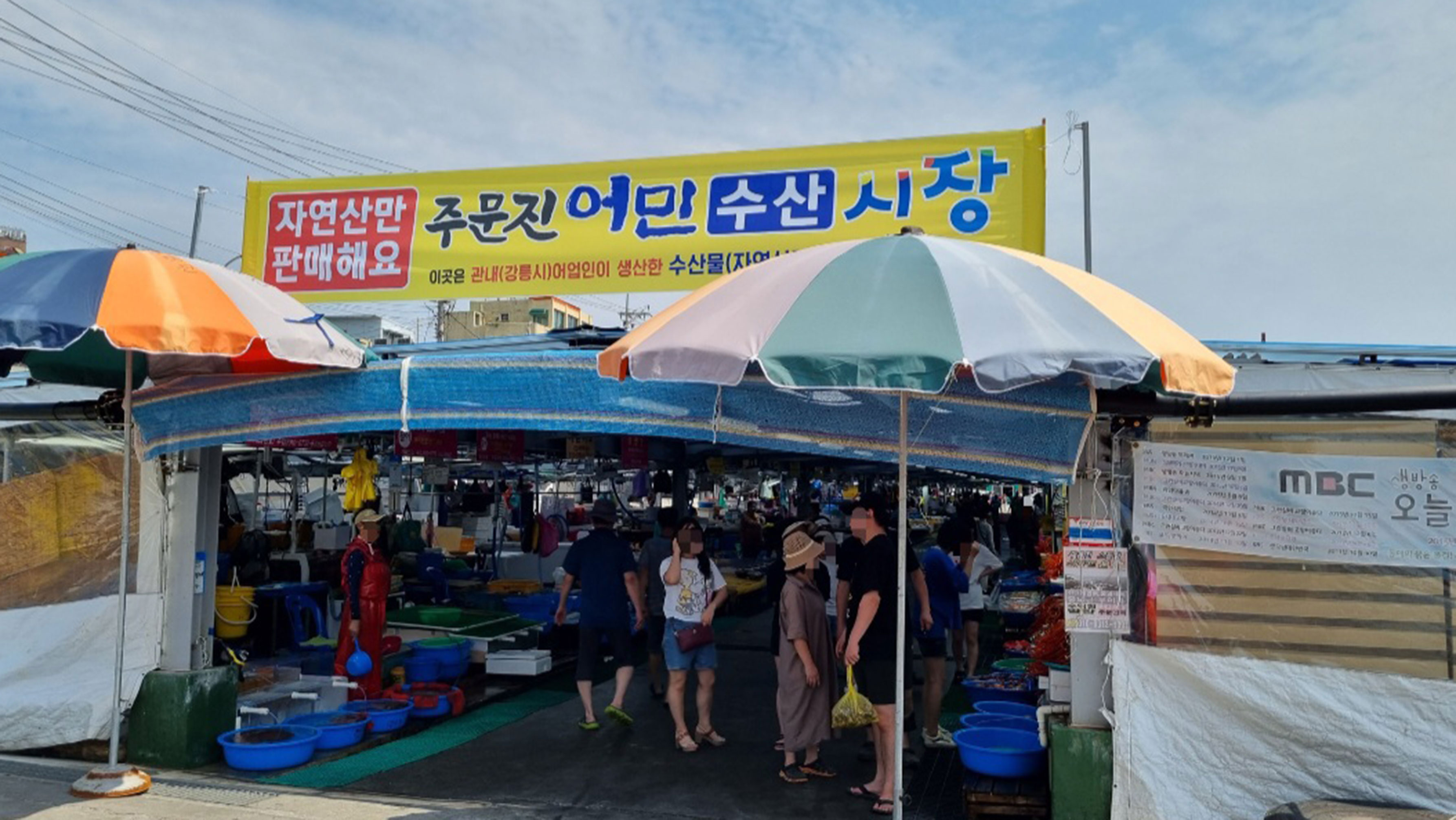 주문진에는 수산물을 파는 시장이 많은데요. 대표적으로 ‘주문진수산시장’, ‘주문진좌판풍물시장’, ‘주문진어민수산시장’ 등이 있습니다. 그 중에서도 ‘주문진어민수산시장’은 자연산만 판매하는 곳으로 항상 발 디딜 틈 없이 손님들의 왕래가 많은 곳이죠. 또한 수산물 판매뿐만 아니라 손질 또는 찜, 그리고 포장 및 택배까지 가능한 것이 아주 편리하답니다.