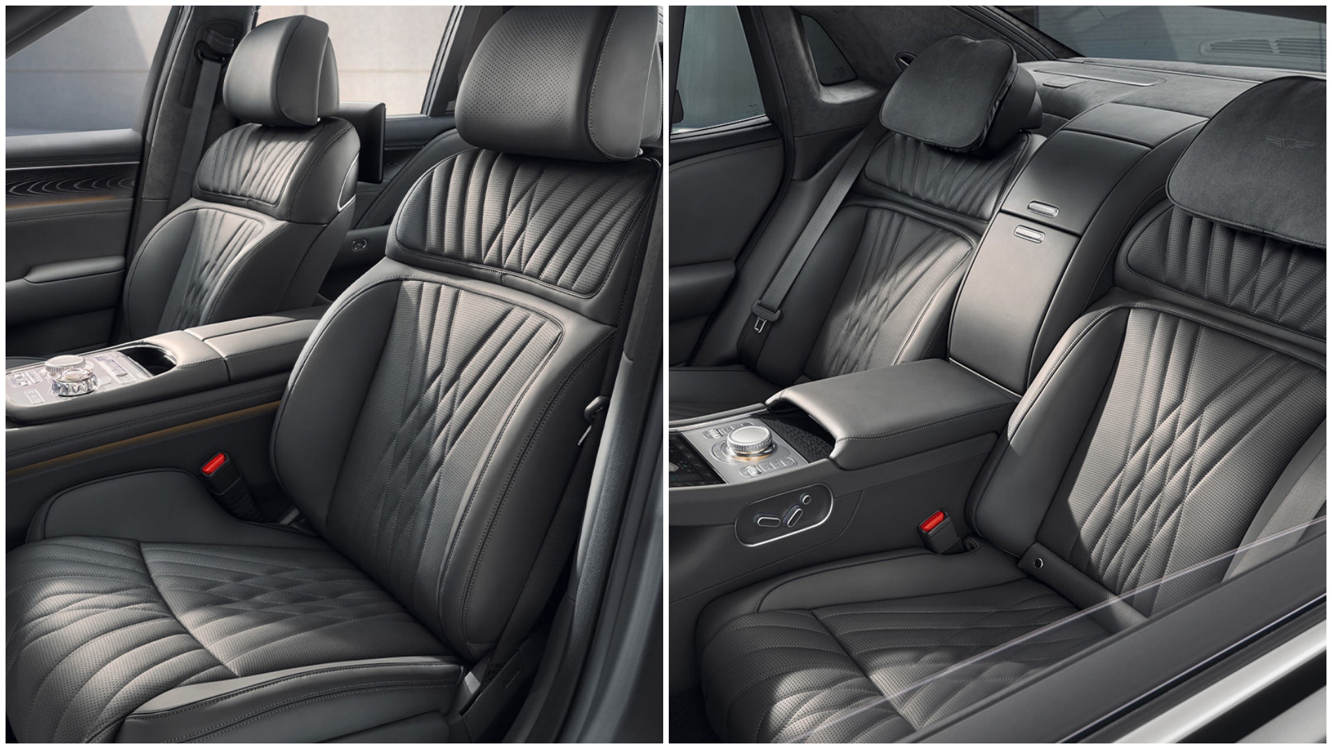 최고급 플래그십 세단인 제네시스 G90은 시트에서도 고급감을 전달합니다. 시트는 볼륨감과 쿠션감이 돋보이는데요. 헤드레스트와 연결된 부분에서 시작한 사선 패턴은 쿠션 익스텐션까지 길게 연결됩니다. 실내 곳곳은 퀼팅이 적용된 프라임 나파 가죽으로 감쌌습니다.