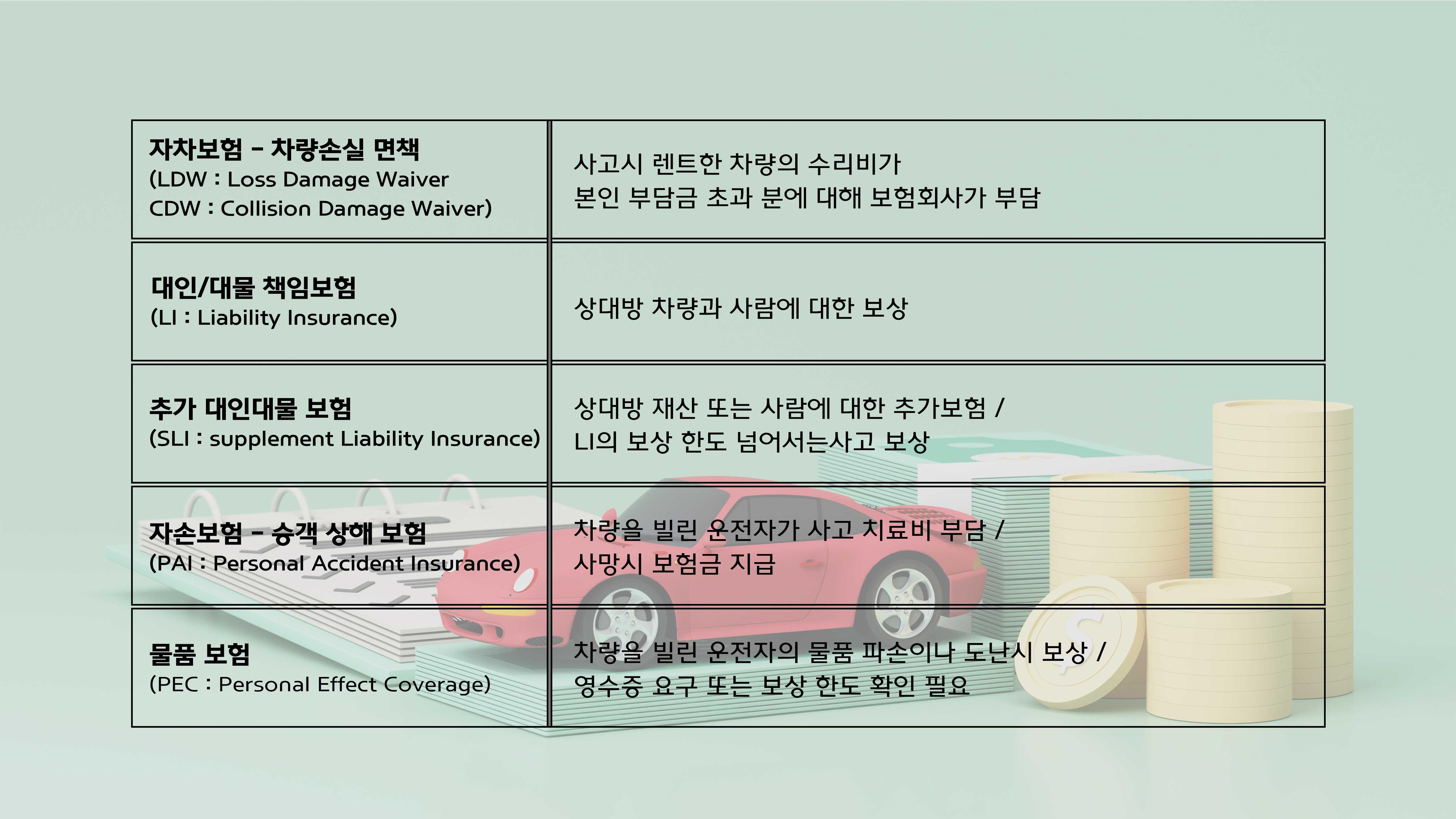 또한 보험 내에 불합리한 조항 있는지 잘 확인하고 가입해야 하며, 면책금 혹은 자기부담금이 높은 렌터카의 경우는 보험을 업그레이드하거나 다른 차량을 예약하는 것을 추천 드립니다.