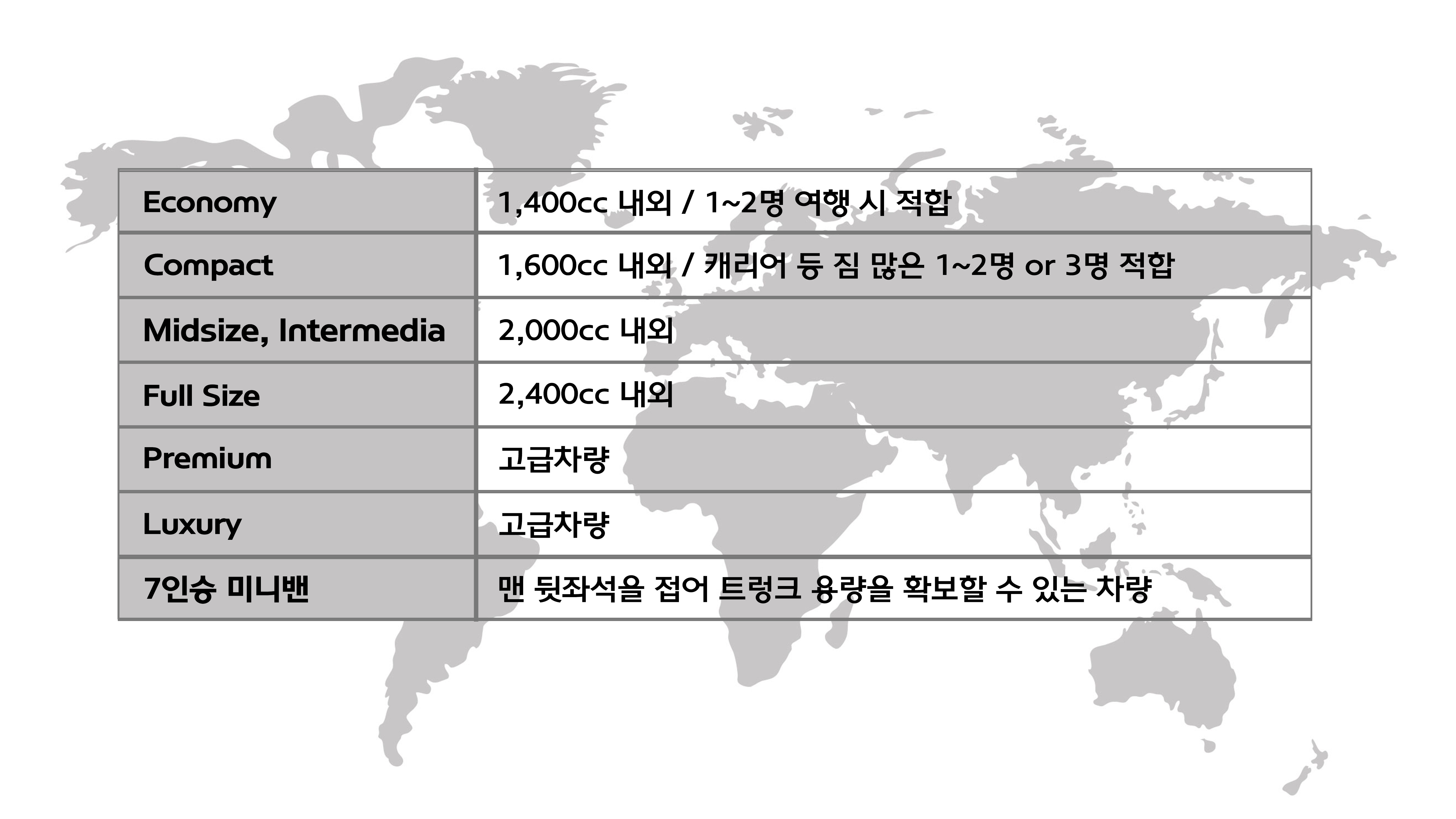 해외 렌터카는 특정 차량의 종류를 직접 선택해 예약하는 것이 아닌 ‘차량 등급’을 예약하면 해당 등급 사이즈의 차량을 받는 시스템으로 이루어져 있습니다.