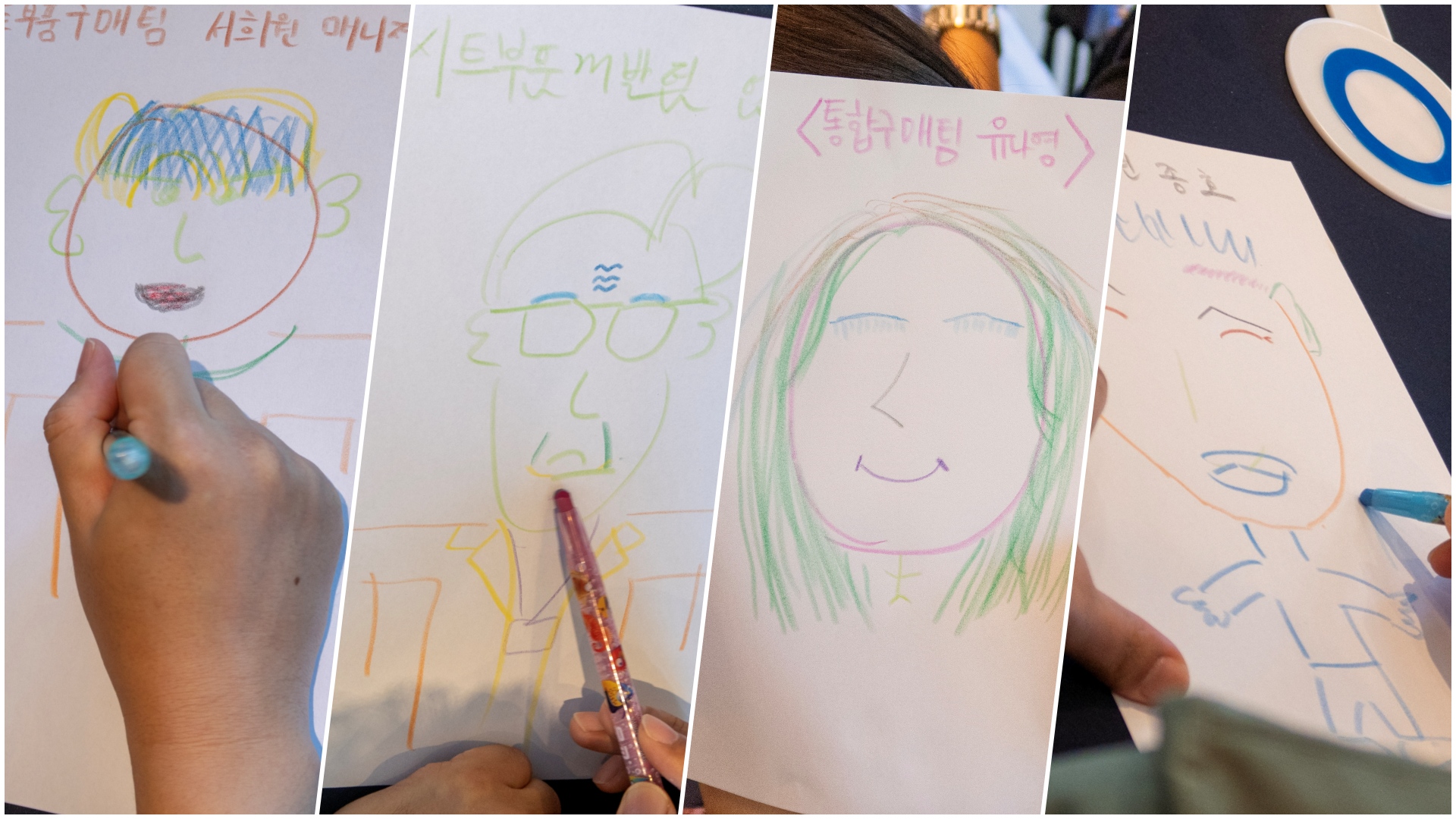 ‘자기소개’시간에 함께 진행된 ‘얼굴 그려주기’는 조별 인원이 돌아가면서 눈, 코, 입, 얼굴 형태를 하나씩 그려주는 코너였는데요. 항상 마주하는 팀원들이지만 얼굴의 한 부분을 그리려고 하니 보조개가 있었는지, 점이나 쌍꺼풀은 어땠었나 등을 생각해볼 수 있는 시간이었습니다. 사실 그 분에게 그런 특징이 있었음을 미처 몰랐는데, 이번 코너를 통해 처음 알게 되기도 했습니다.