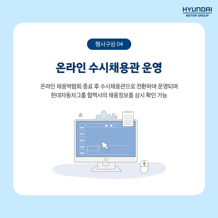현대자동차그룹이 11월 1일(수)부터 11월 14일(화)까지 ‘2023 현대자동차그룹 협력사 온라인 채용 박람회’를 개최합니다.