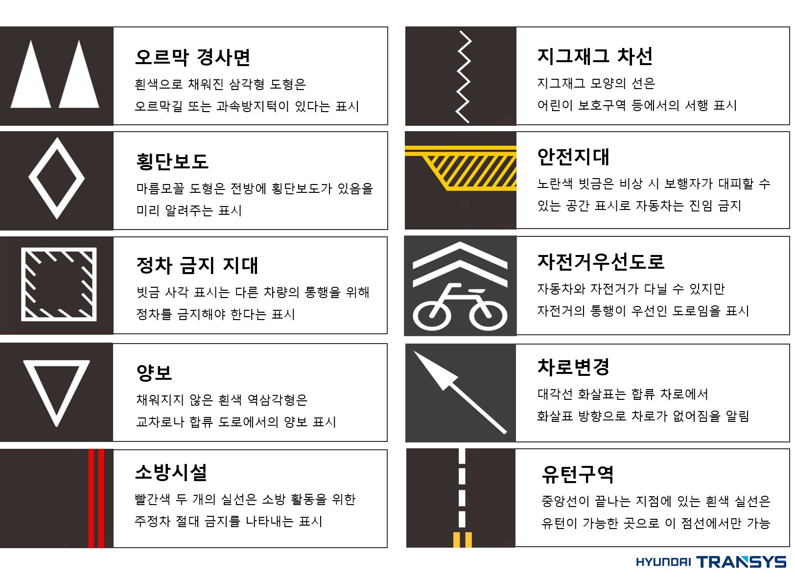 지금까지 도로 위에 그려진 다양한 신호 표시를 알아봤습니다. 무심코 지나치며 알지 못했던 신호지만 모두가 안전한 교통 환경을 위해 꼭 알아두어야 할 표시들입니다. 모두 즐겁고 안전한 운전되시기 바랍니다.
