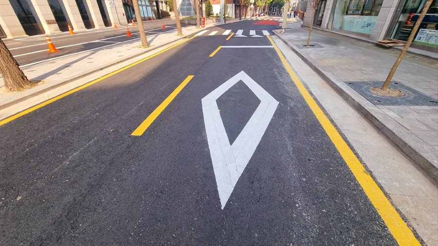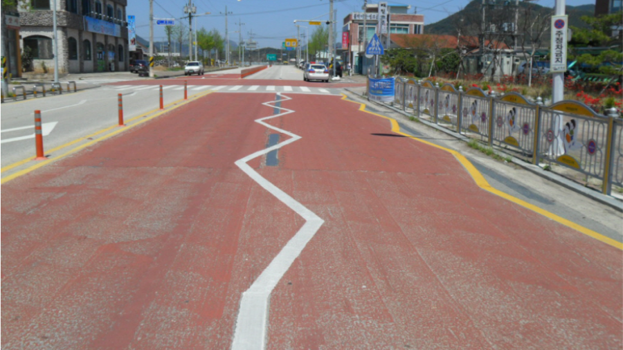 도로에서 많은 분들이 혼란을 느끼는 표시 중 하나가 지그재그 차선입니다. 지그재그 차선은 서행하라는 뜻인데요. 어린이 보호구역같이 서행이 필요한 지점에 자주 나타납니다. 실제로 도로가 좁아 보여 운전자가 속도를 줄이게 되는 효과가 있습니다.
