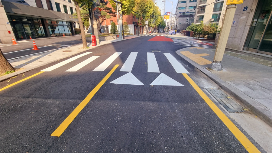 종종 차선과 차선 사이 마름모꼴 도형이 새겨진 모습을 볼 수 있습니다. 마름모꼴 도형은 전방에 횡단보도가 나타난다는 걸 미리 알려주는 표시입니다. 운전자가 사전에 주의를 기울여 속도를 줄임으로써 보행자 사고를 예방하기 위함이죠.