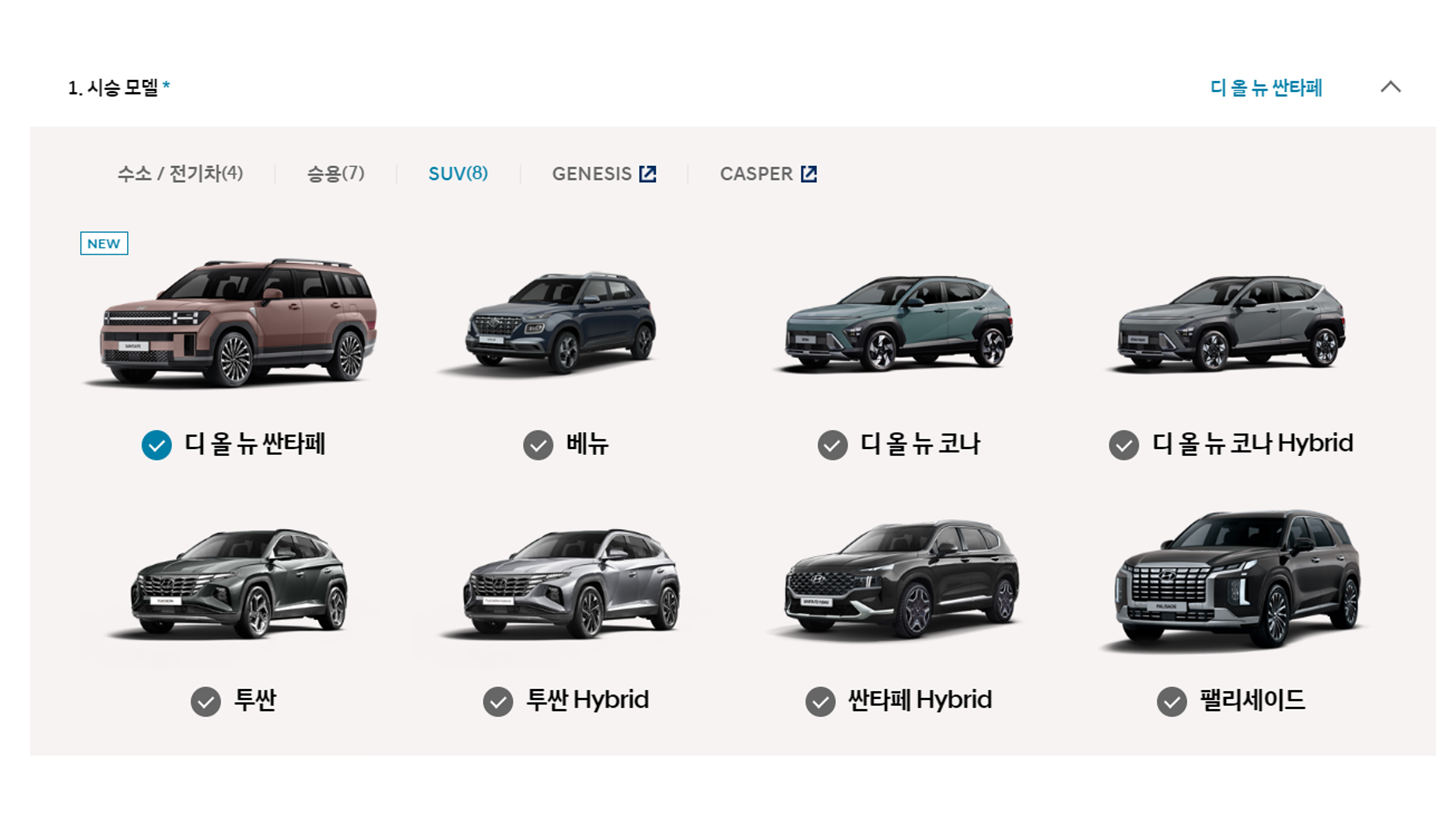 원하는 차량을 선택해서 시승을 할 수 있습니다. 현재 판매 중인 대부분의 차량이 준비되어 있는데요. 수소/전기차, 승용, SUV 중 원하는 모델 분류를 선택한 후 해당 모델을 선택하면 됩니다.