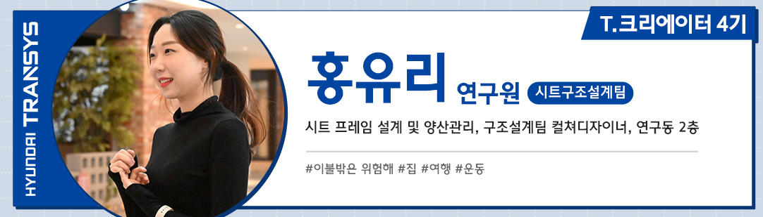 안녕하세요, 현대트랜시스 시트구조설계팀에서 근무하고 있는 T.크리에이터 4기 홍유리 연구원입니다. 어느덧 2023년도 막바지로 접어들고 있는데요. 연말은 자동차 할인이 가장 많이 되는 시기라 차량 구매 예정자들은 어떤 차를 구매할지에 대한 고민이 더욱 깊어질 것 같습니다.
