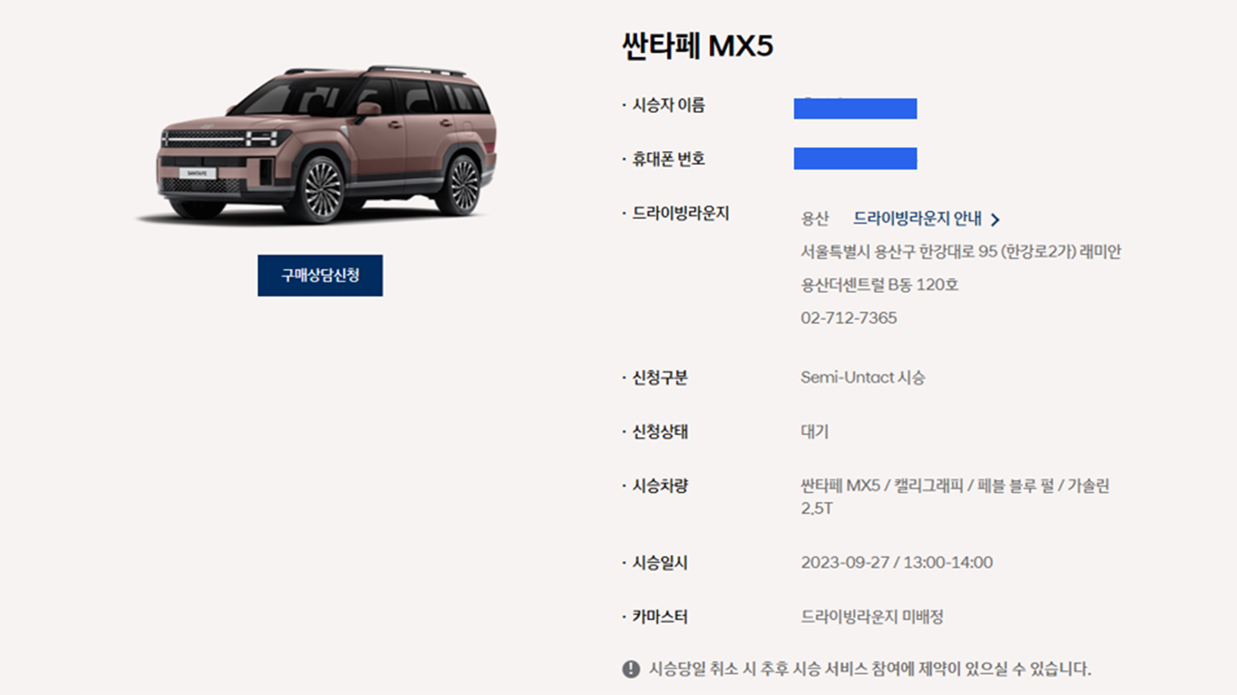 이제 예약도 완료했으니 시승 당일 시간에 맞춰 방문하면 끝입니다. 정말 간단하죠? 해당 드라이빙 라운지에 운전면허증을 지참하여 방문 후 이름과 예약 시간을 말하면 정말 간단한 이용 신청서를 주시는데요. 신청서 작성 후 주차장에 내려가 해당 차량을 찾으면 시승이 시작됩니다.