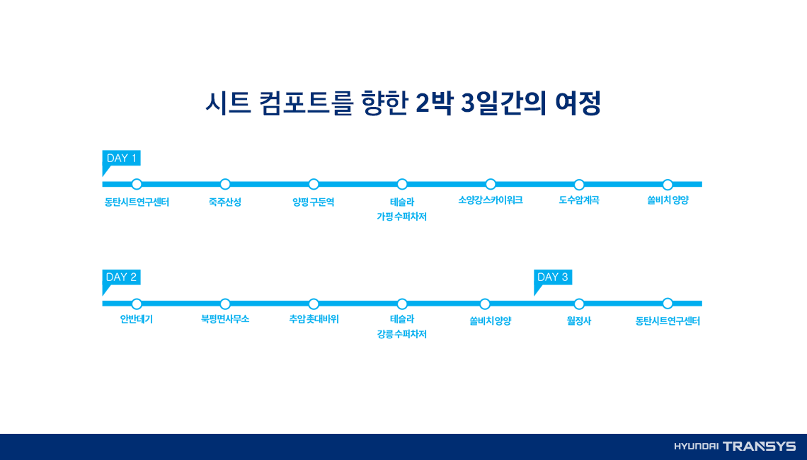 시트의 편안함은 자동차의 품질을 높이는 중요한 요소입니다. 그래서 시트는 엔진만큼 중요하죠. 더 나은, 더 좋은 시트를 제작하기 위해 시트연구원들이 연구에 도움이 될 세단을 직접 체험하는 주행 프로젝트를 진행했습니다. 2박 3일 동안 쉴 틈 없이 진행되었던 프로젝트의 취재기, 지금 바로 출발합니다.