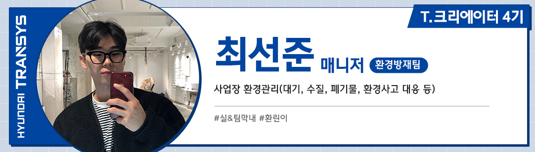 안녕하세요, 저는 현대트랜시스 환경방재팀에서 근무하고 있는 T.크리에이터 4기 최선준 매니저입니다.