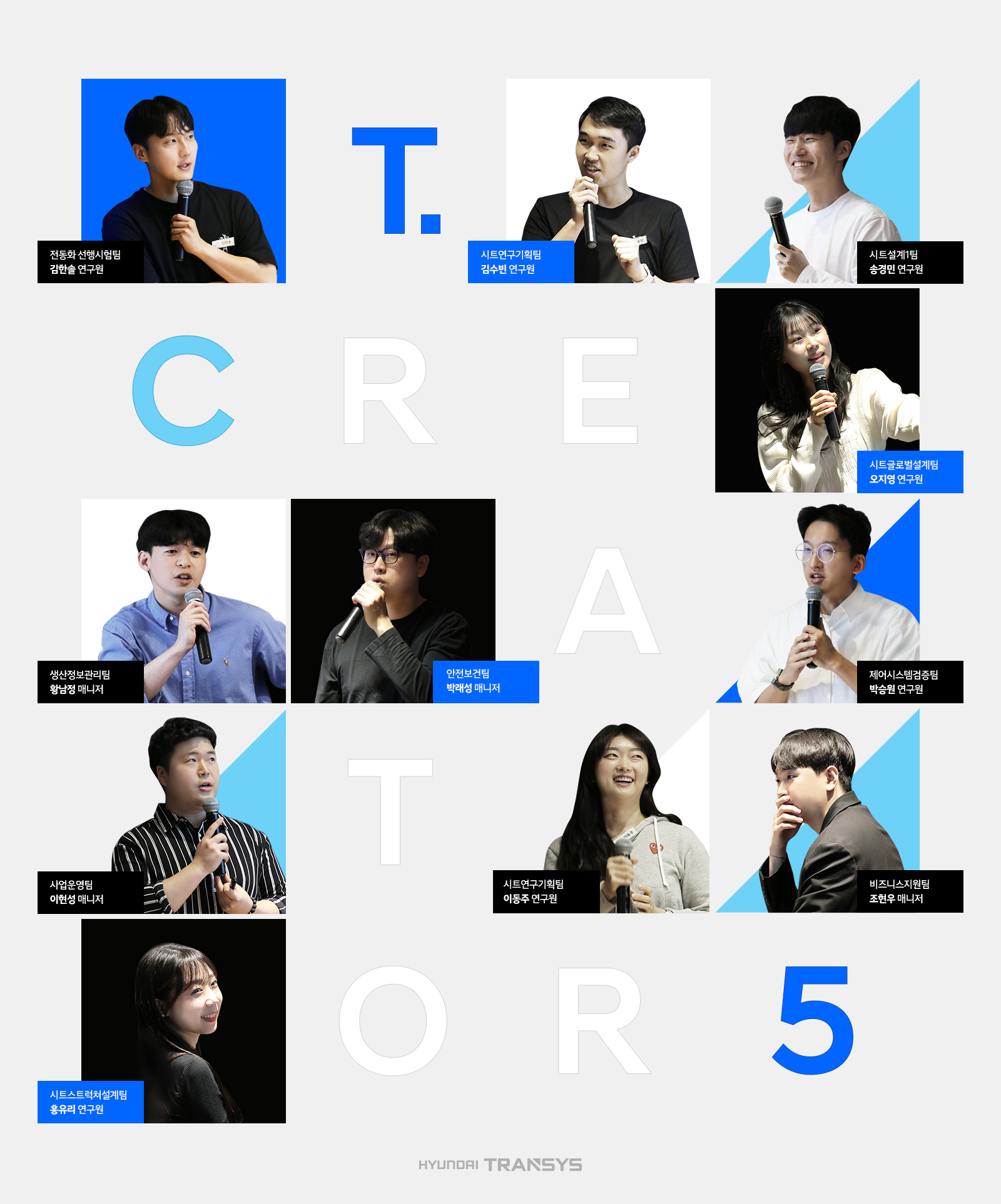 이번 T.크리에이터들은 연구개발, 영업, 생산, 안전, 지원까지 다양한 직무를 가진 것이 특징입니다. 직무만큼 관심사도 다채롭고 트렌디한 감각과 남다른 재치로 뭉친 이번 5기 T.크리에이터들, 이들이 전해줄 현대트랜시스의 이야기가 벌써부터 기대됩니다.