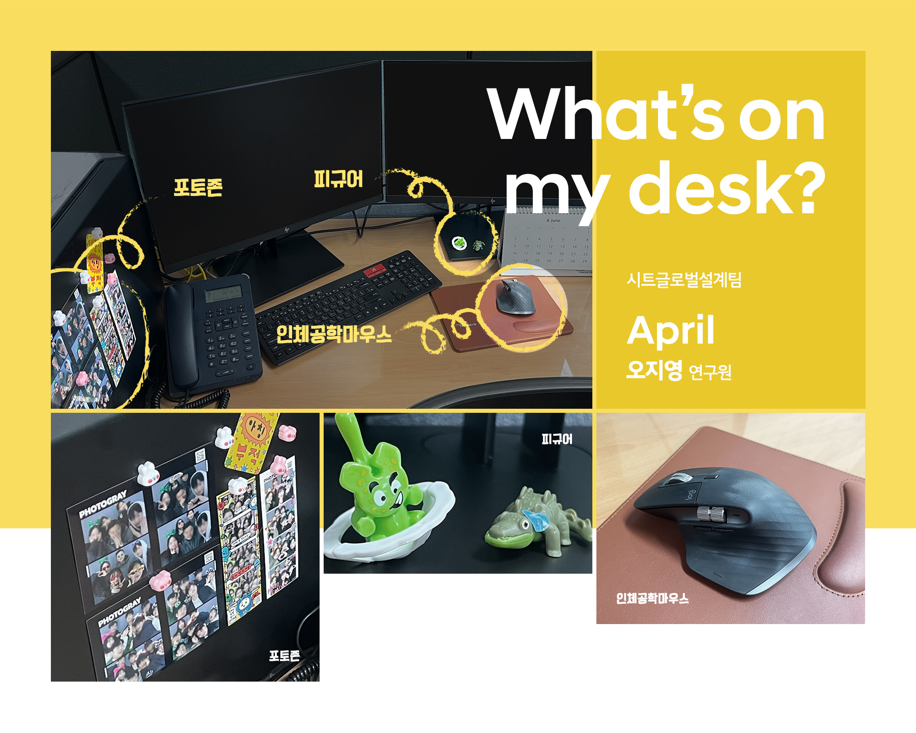 동기들과 찍은 인생네컷 & 킨더조이 피규어책상에 포토존을 만들어서 입사 동기들과 찍은 ‘인생네컷’과 ‘개운한 아침 부적’을 붙였어요. 업무하다 가끔 보면 사진 찍던 그때가 떠올라 웃기기도 하고 힘이 납니다. 동기들과는 꼭 오래된 친구처럼 가깝게 지냅니다. 업무는 물론, 사적인 고민도 나누며 서로 돕고 있어요. 이 기회를 빌려 고마운 동기들에게 ’계속 함께 하자!’고 전하고 싶어요!