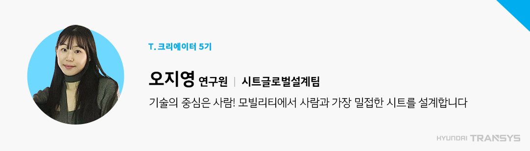 현대트랜시스 시트글로벌설계팀 오지영 연구원입니다. 저희 팀은 리비안, 루시드 등 글로벌 완성차에 공급하는 시트의 처음부터 마지막까지 즉, 개발부터 양산까지 늘 시트와 함께하는 팀이라고 할 수 있는데요. 초기 데이터를 활용한 패키지 검토와 더불어, 프로토타입-파일럿-양산 등의 단계를 거쳐 직접 제품의 실물을 보며 문제점을 개선하는 등 다양한 업무를 진행하고 있습니다.