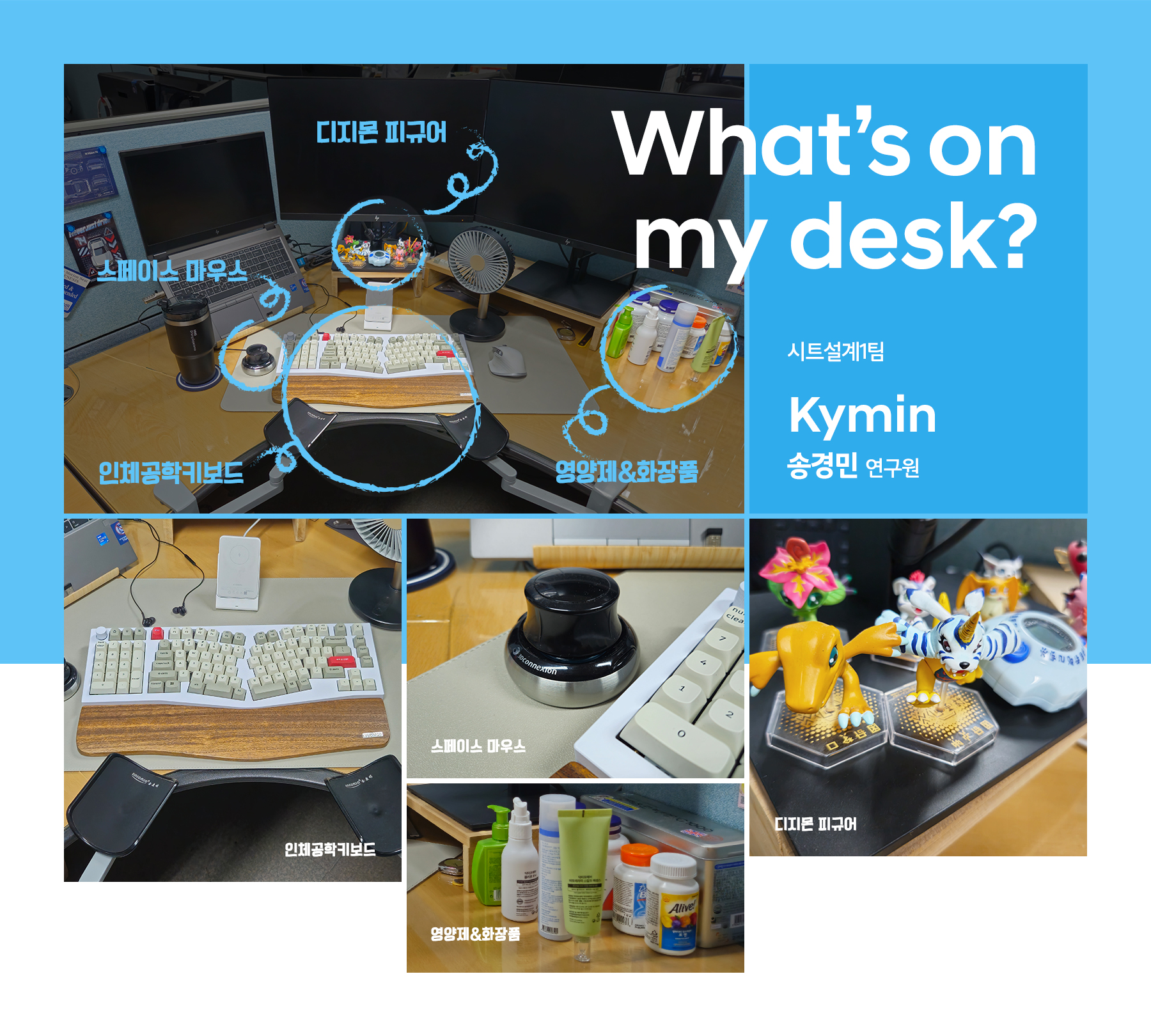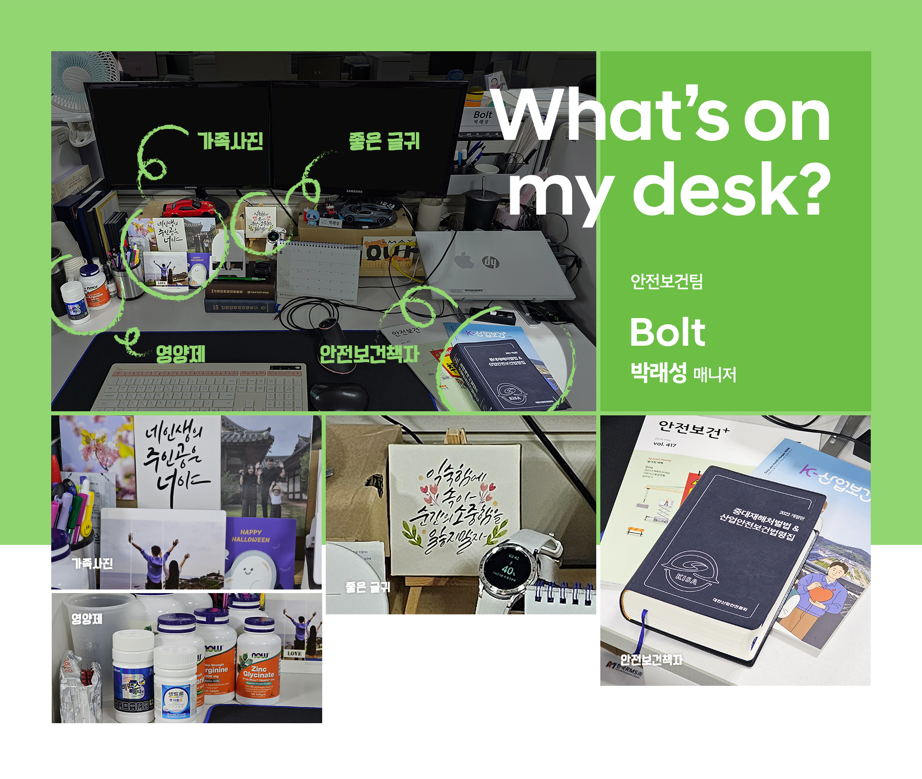 제 책상에선 가장 보편적인 직장인이자 가장의 모습을 볼 수 있을 것 같습니다. 보통 업무를 하다 보면 회사 일에만 몰두하기 쉽습니다. 업무 중간 정서적으로 힘이 되는 가족사진과 글귀를 보거나, 건강을 위한 영양제를 챙겨 먹으면서 제 자신과 주변을 돌아보곤 합니다.