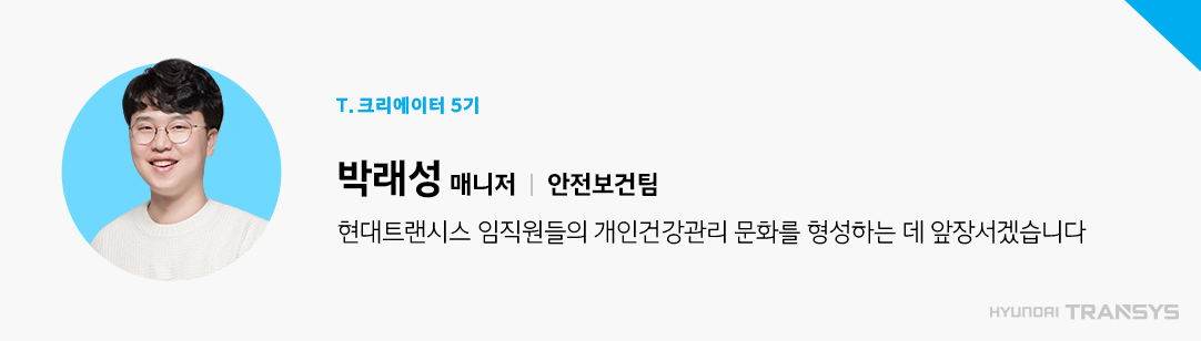 현대트랜시스 안전보건팀 박래성 매니저입니다. 저희 팀은 안전보건 관련 법규 준수와 쾌적한 작업 환경 조성을 통해 임직원들의 건강을 확보하기 위해 노력하고 있습니다. 저는 보건 관리 분야 업무를 담당하며, 임직원 대상 각종 질환과 정신 건강 관리를 위한 다양한 건강증진 프로그램을 운영합니다. 지역 보건소나 소방서와 협력해 심폐소생술, 응급처치 교육도 함께 진행하고 있습니다.