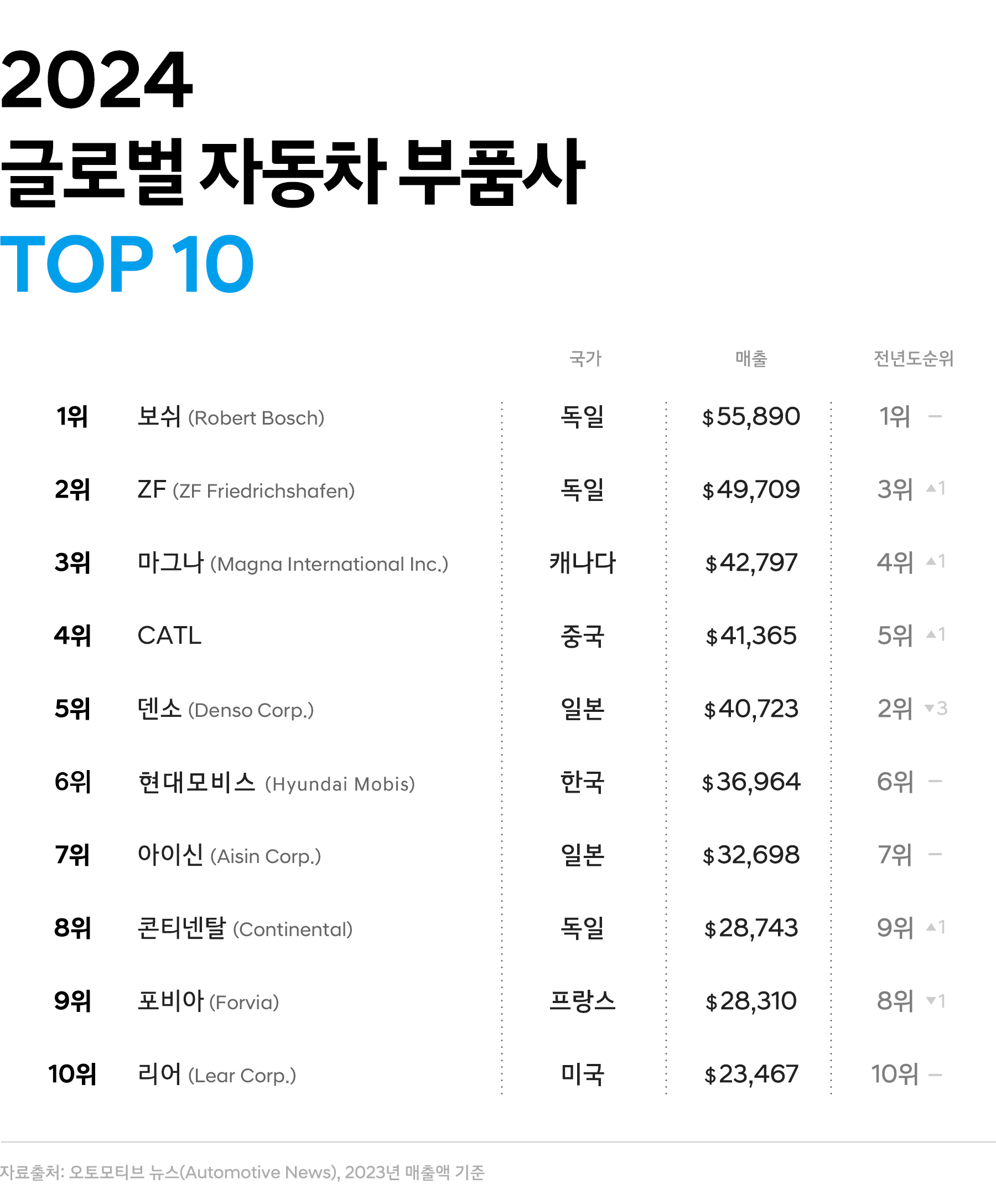 미국의 자동차 전문 매체 ‘오토모티브뉴스(Automotive News)’는 매년 전 세계 자동차 부품사의 매출을 기준으로 ‘글로벌 100대 자동차 부품사 순위(2024 Top 100 parts suppliers by OEM sales)’를 선정하고 있습니다. 해당 지표를 통해 세계 자동차 시장 속 부품사의 경쟁력 및 최신 모빌리티 산업 트렌드를 가늠할 수 있죠. 과연 올해는 어떤 기업이 시장의 판도를 뒤흔드는 변화와 가능성을 보였는지 알아보겠습니다.