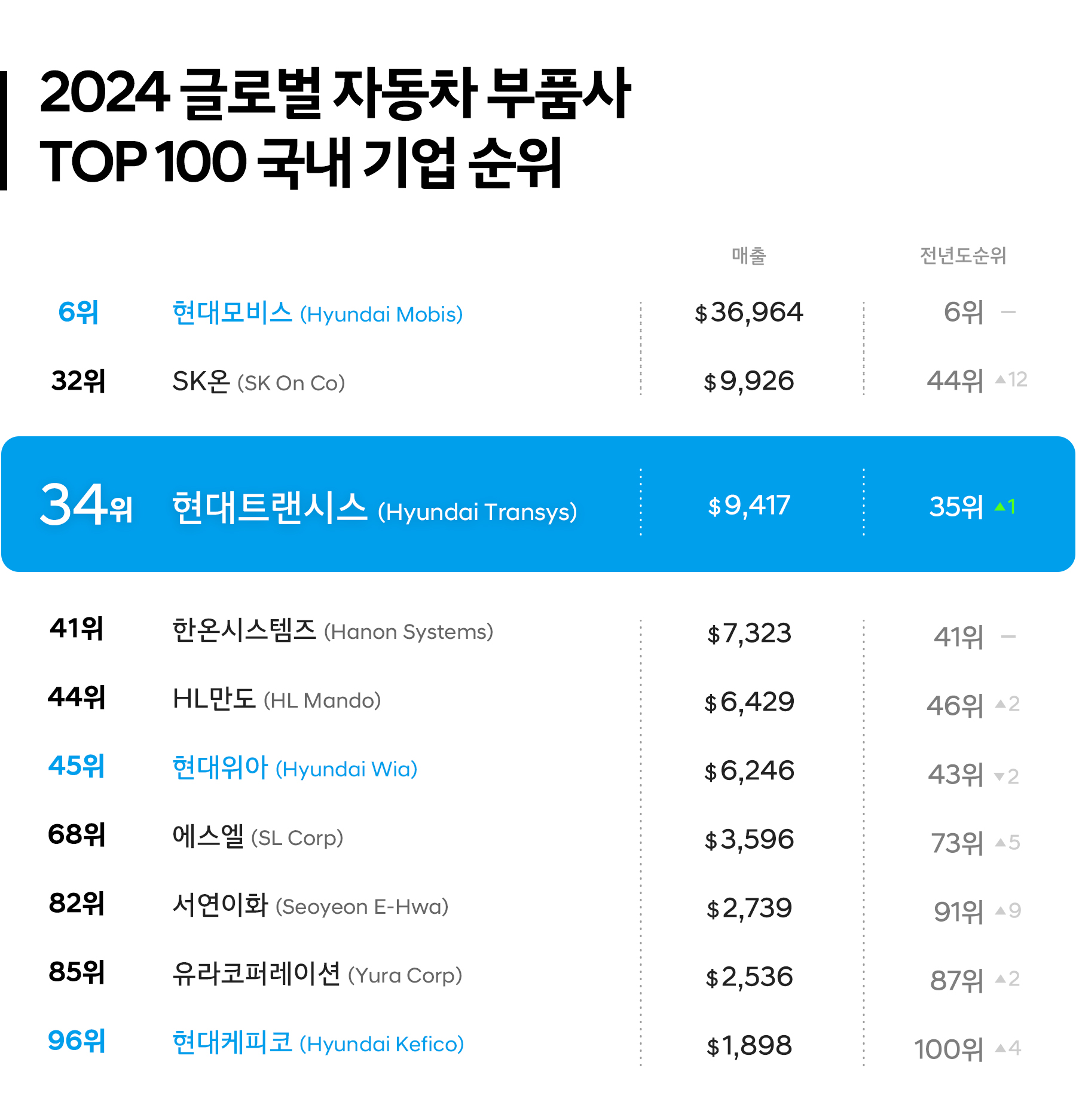 100대 랭킹에는 총 10곳의 국내 기업이 이름을 올렸습니다. 그중 현대자동차그룹사로는 현대모비스(6위), 현대트랜시스(34위), 현대위아(45위), 현대케피코(96위)가 두각을 나타냈는데요. 국내 기업 중 유일하게 상위 10위권에 든 현대모비스는 6위로 지난해 순위를 지켰습니다. 현대모비스의 지난해 누적 매출은 369억 달러(약 51조 원)에 달하는데, 이는 전동화 부품의 해외 시장 진출이 높은 성과를 달성했기 때문입니다.