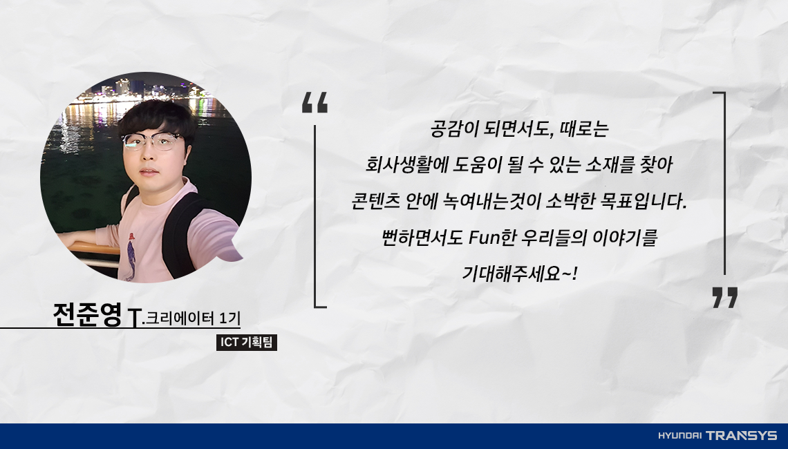 A. ICT추진실에서 5.년.째. 막내를 담당하고 있는 전준영 매니저입니다. ICT기획팀에서 PPT와 Excel을 맡고 있는 만큼 멋진 글을 써보고 싶은데요. 올해부터 리뉴얼 된 회사홍보 콘텐츠들을 보면서 뭔가, 뭔가 본격적으로 진행될 것만 같은 기대감이 들고 있습니다. 19년에는 사내기자단 활동에 참여하였는데, 20년에도 T.크리에이터로써 계속 활동할 기회를 얻게 되어 콩팥이 두근두근합니다.