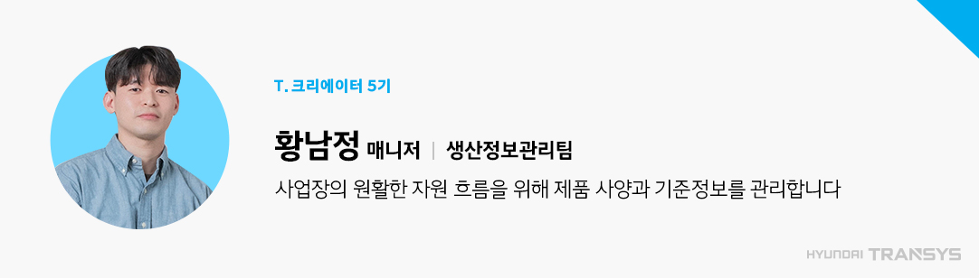 저는 생산정보관리팀에서 제품 사양 관리 업무를 담당하고 있습니다. 제 주요 업무는 제품의 구동과 조작 방식, 기능 정보, 적용 차종, 제조 BOM(Bill of Material) 등 기준 정보들을 바탕으로, 제품 설계 변경 사항을 생산라인에 적용하기 위한 시점 협의를 주관하는 일입니다. 제가 근무하고 있는 서산 지곡 공장은 파워트레인 생산을 위한 주요 부서들이 위치해 있습니다. 원활한 공장 가동을 통해 완벽한 품질의 제품을 적기에 생산할 수 있도록, 지원부서부터 생산부서까지 다양한 조직과 다수의 인원들이 협업하고 있습니다. 저희 사업장의 가장 특징은 생산, 품질, 출하, 보증까지 실제 제품이 생산되는 과정을 명확하게 확인할 수 있다는 점입니다. 저 역시 제가 하는 업무가 실제 생산 공정에 어떠한 영향을 끼치는 지 바로 체감할 수 있기 때문에, 책임감과 자부심을 갖고 일하고 있습니다.