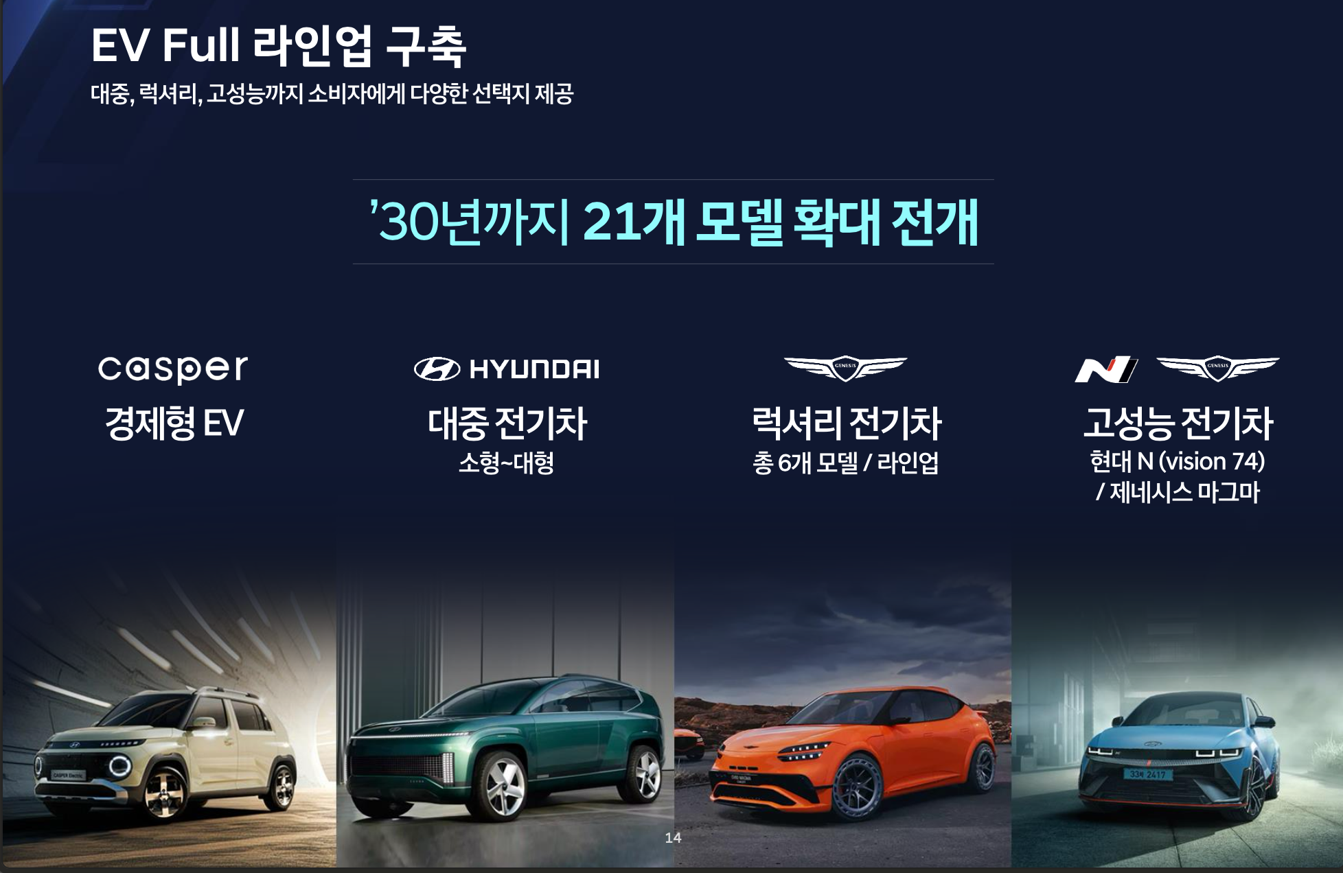 전기차는 2030년까지 시장 회복을 지켜보면서 모델 수를 확대해 나가기로 했습니다. 하이브리드와 주행거리 연장형 전기차(EREV)로 수익성을 확보하는 한편 전동화 수요 회복이 예상되는 2030년까지 점진적으로 전기차 차종을 21종까지 늘려가기로 했습니다. 특히 경제형 EV에서부터 럭셔리·고성능까지 전기차 풀라인업을 구축해 소비자들에게 다양한 선택지를 제공하며 다가올 전기차 시대를 선도할 방침입니다.