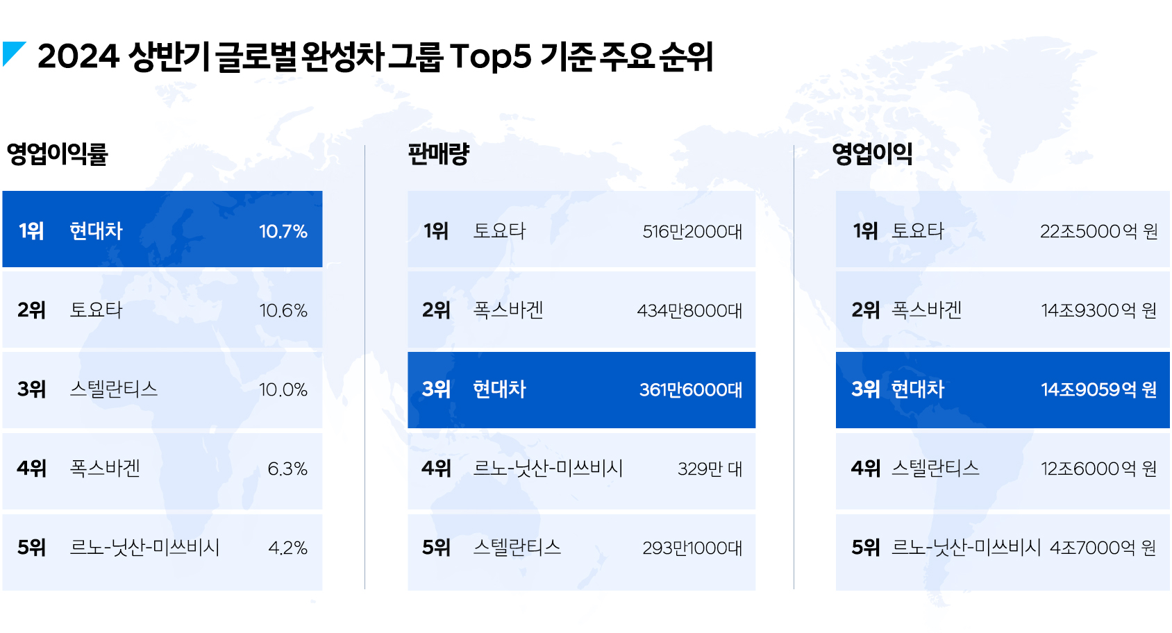글로벌 자동차 제조사들의 상반기 실적이 발표됐습니다. 성적에 따라 희비가 엇갈린 가운데, 현대차그룹(현대자동차, 기아, 제네시스)은 판매와 수익 면에서 상위권을 유지하며 2년 넘게 유지하고 있는 Big 3의 위치를 견고히 다지는 데 성공했죠.
