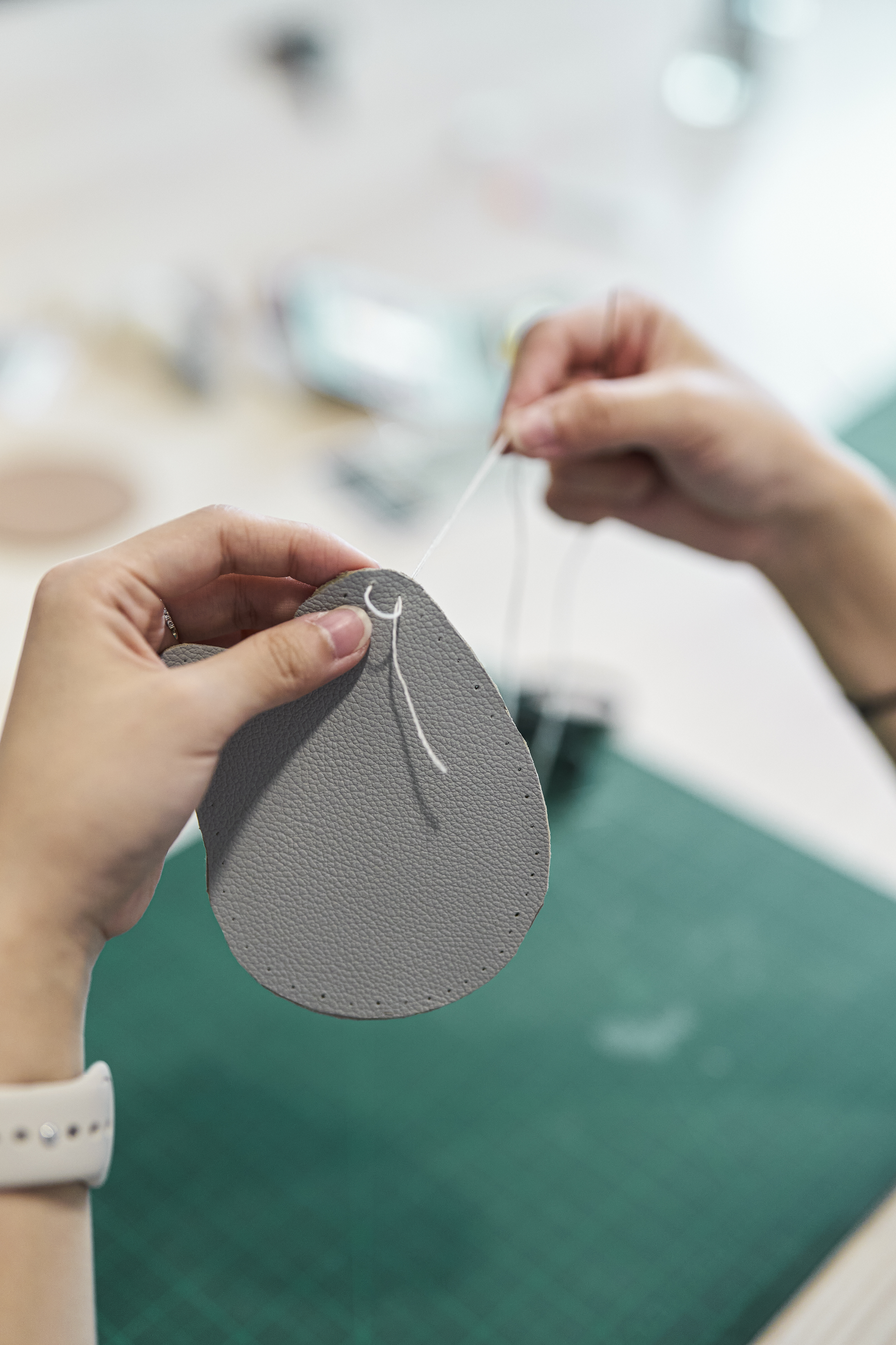 원하는 모형으로 두 장의 가죽을 재단한 후에는 접착과 박음질이라는 중요한 작업에 들어갑니다. 그런데 가죽 양면 가장자리를 박음질로 단단하게 고정하는 데 생각보다 오랜 시간이 걸렸습니다. 표면은 부드럽지만, 두툼한 천가죽을 손으로 꿰매기가 쉽지 않았기 때문인데요. 다행히 모두가 끈기를 발휘해 끝까지 바느질을 마칠 수 있었습니다.