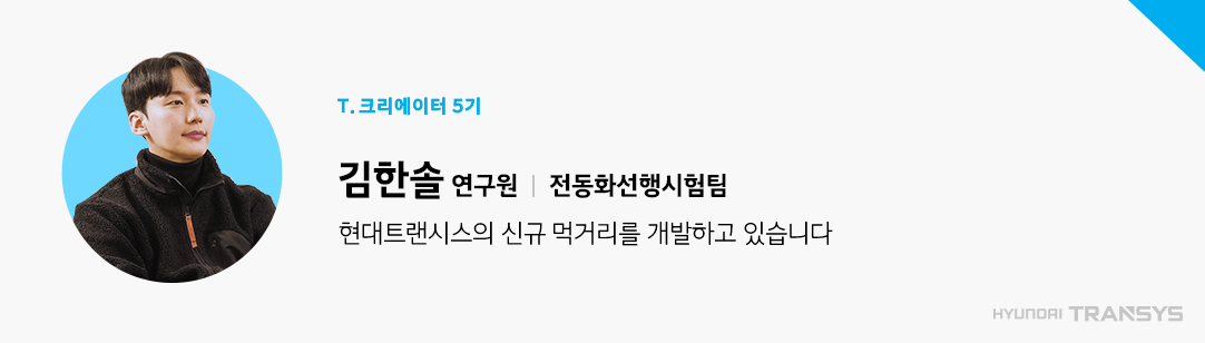 김한솔 연구원은 레고와 건담, 미니카를 만들며 과학에 관심을 가지기 시작했다고 합니다. "어릴 때부터 뭐든 만드는 걸 좋아했어요. 특히 로봇 동아리 활동을 하면서 기계에 대한 흥미를 가지기 시작했죠. 대학에서도 기계공학을 전공했고, 자연스럽게 전동화선행시험팀에서 일하게 된 것 같습니다."
