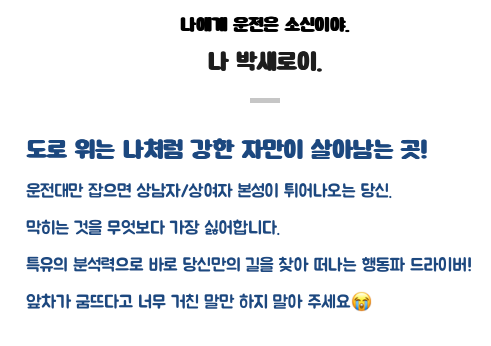 각자의 운전 성향부터 알아보겠습니다. MBTI 검사와도 비슷한데요. 재미로 보는 테스트이긴 하지만, 운전과 관련된 문항에 답하면서 평상시 운전하는 내 모습을 떠올려보는 겁니다. 결과는 드라마 캐릭터로 알려주는데, 생각보다 날카로운 분석에 놀라지 마세요.