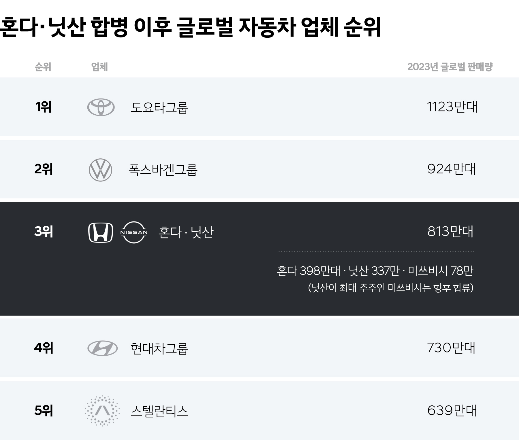 일본 2위와 3위 자동차 업체인 혼다와 닛산이 지난달 23일 도쿄에서 공동 기자회견을 갖고 합병 추진을 공식화했습니다. 내년 6월까지 협상을 마무리하고, 2026년 8월에는 이 회사들을 운영할 지주회사를 설립해 상장시킬 계획입니다. 새롭게 탄생하는 자동차 그룹은 현대차그룹을 제치고 글로벌 3위에 오르게 됩니다. 닛산이 최대 주주로 있는 일본 4위 업체 미쓰비시는 올해 1월까지 검토를 거쳐 합병 여부를 판단합니다.