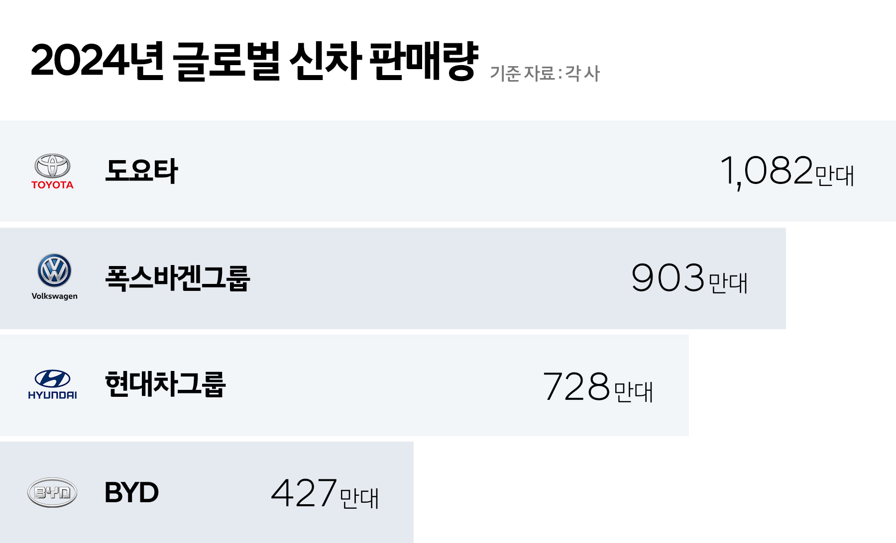 글로벌 완성차 시장에서는 치열한 경쟁이 이어지고 있습니다. 도요타는 지난해 전 세계에서 1,082만여대의 신차 판매 실적을 기록했습니다. 역대 최고였던 2023년 1,123만대보다 3.7% 감소한 수준입니다. 이는 경쟁업체인 폭스바겐그룹 판매량보다 100만대 이상 많아 도요타그룹은 지난해까지 5년 연속 판매량 기준 글로벌 완성차 1위에 오르는 데 성공했습니다. 2위는 전년 대비 2.3% 감소한 903만대를 전 세계에서 판매한 폭스바겐그룹이 차지했습니다. 3위는 723만 1천대의 글로벌 판매량을 기록한 현대차그룹입니다.