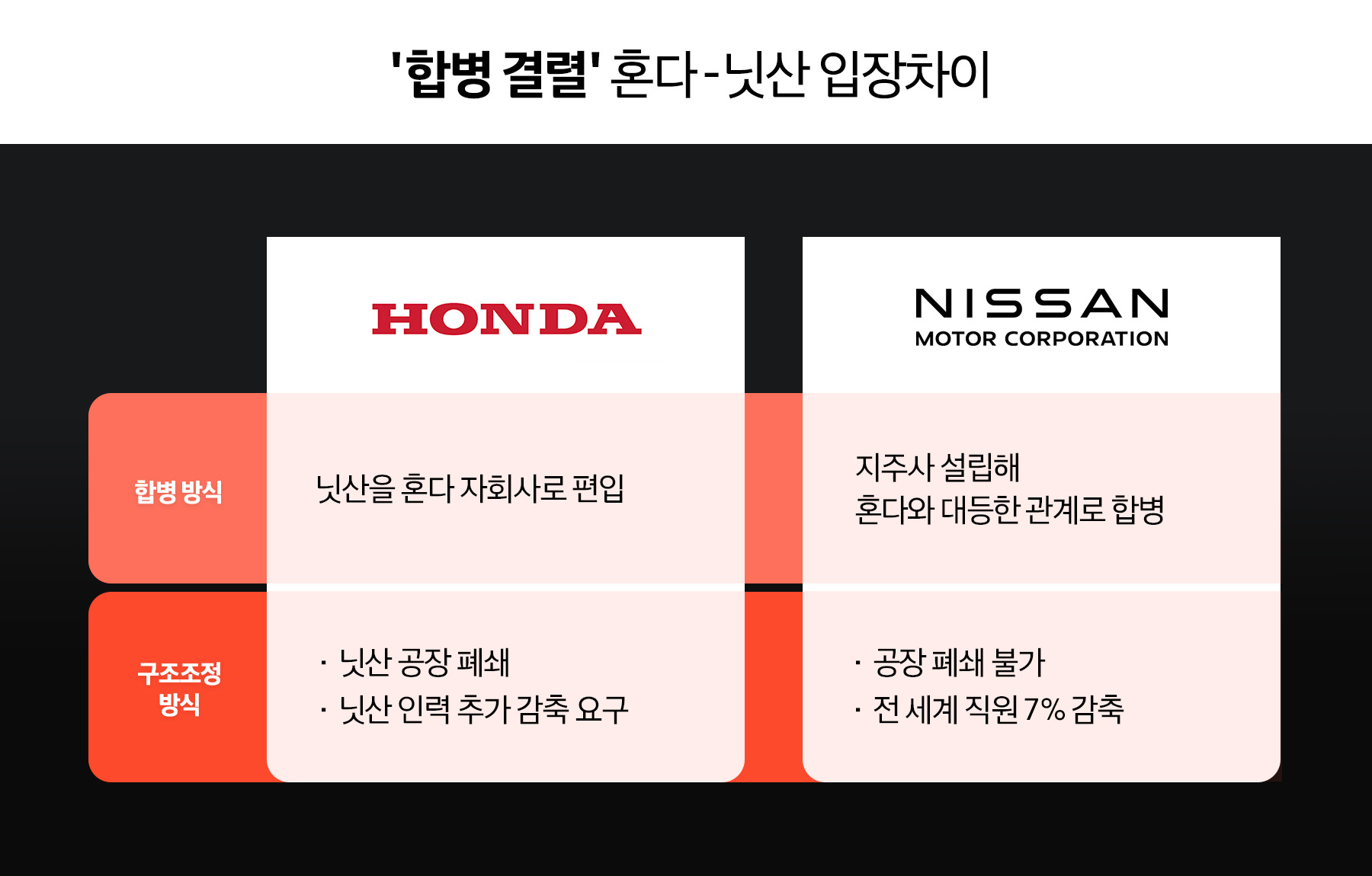 니혼게이자이신문에 따르면, 합병 무산이 무산된 결정적 계기는 합병 방식에 대한 의견 차이입니다. 양사는 작년 말 지주사를 설립해 혼다와 닛산을 지주사의 자회사로 두는 합의를 체결했지만, 혼다 측에서 닛산을 혼다의 자회사로 두는 방안을 추진하면서 닛산이 반발한 것입니다.