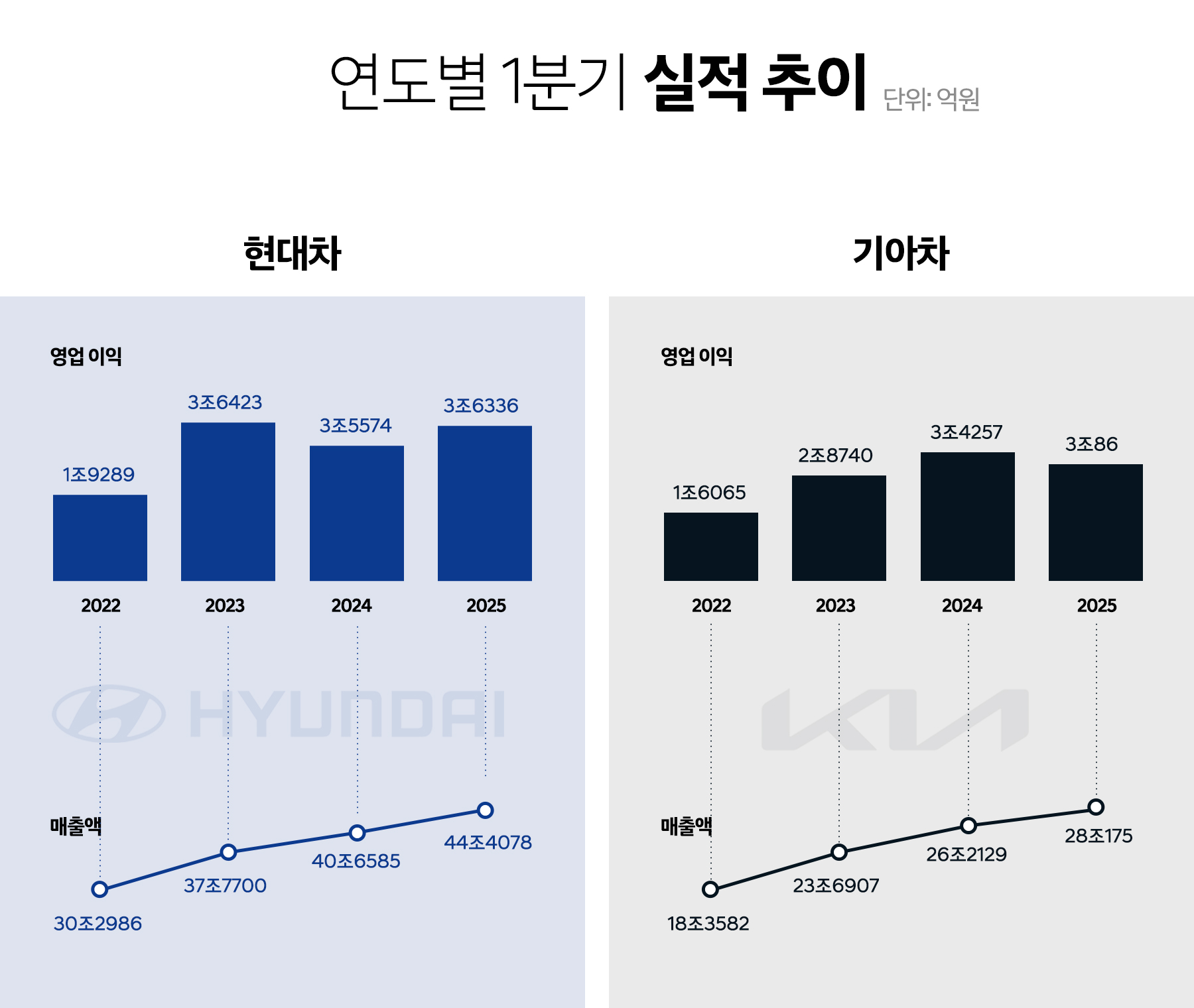 기아도 1분기 매출 28조 원을 넘어서며 역대 최대 매출을 기록했습니다. 기아는 미국 정부의 고율 관세 부과에도 판매 성장을 이어가면서 3조 원대 영업이익도 지켜냈습니다. 기아는 1분기 연결기준 매출이 지난해 동기 대비 6.9% 증가한 28조 175억 원을 기록했습니다. 영업이익은 지난해 같은 기간보다 12.2% 감소한 3조 86억 원, 순이익은 14.8% 줄어든 2조 3926억 원을 각각 기록했습니다. 영업이익이 감소했지만 미국의 관세 충격과 마이너스 경제성장률(-0.2%)을 기록한 내수시장의 부진을 고려하면 선방했다는 평가입니다.