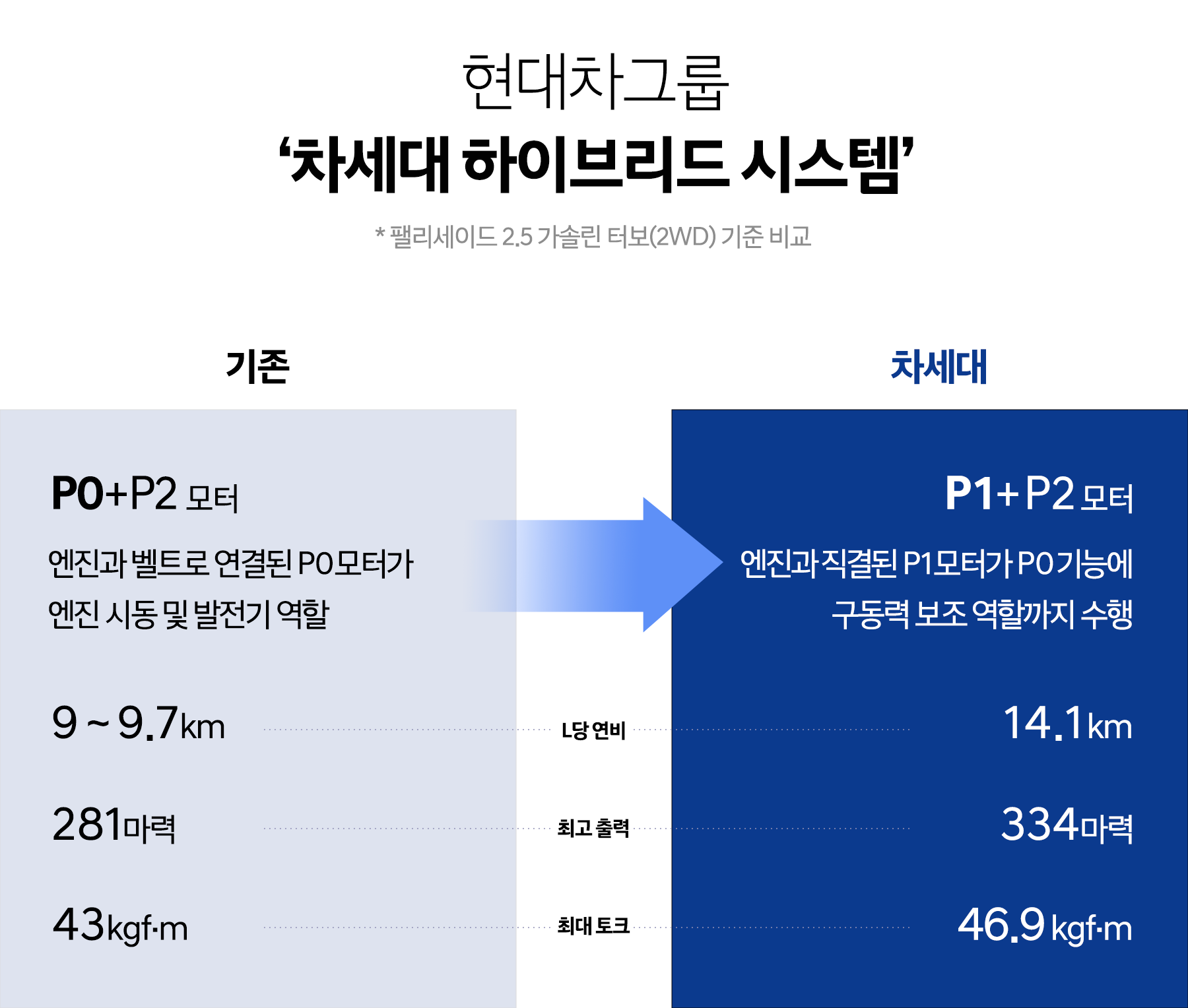 성능을 대폭 개선한 새 시스템은 기존에 구동 및 회생 제동을 담당하던 P2 구동 모터* 외에 구동력 보조 기능을 수행하는 P1 모터를 새로 추가해 병렬형 구조로 설계됐습니다. 특히 P1 모터는 엔진 직결 방식으로 동력 손실을 최소화하고, 엔진 진동 및 소음을 줄인 것이 특징입니다.