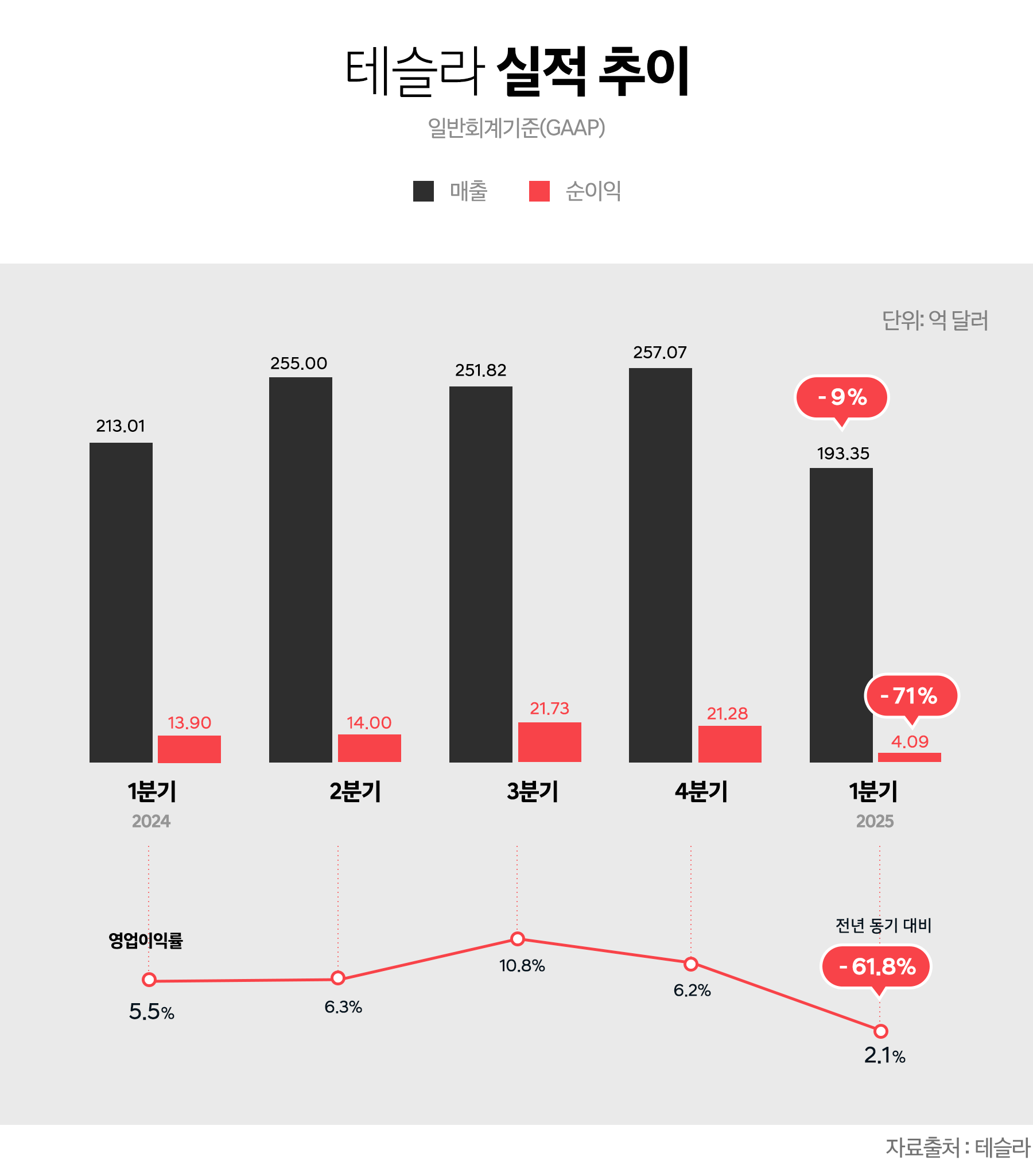 이러한 시장 변화 속에 테슬라는 1분기 실적 부진을 겪고 있습니다. 테슬라가 발표한 실적 보고서에 따르면 지난 1분기 총매출은 193억3천500만달러(약 27조6천336억원)로, 지난해 같은 기간보다 9% 감소했습니다. 1분기 순이익은 4억900만달러(약 5천845억원)에 그쳐 작년 동기(13억9천만달러) 대비 71%나 급감했습니다. 영업이익률은 2.1%를 기록했습니다. 이는 1년 전(5.5%)보다 3.4%포인트, 직전 분기(6.2%)보다는 4.1%포인트 낮아진 수치입니다.