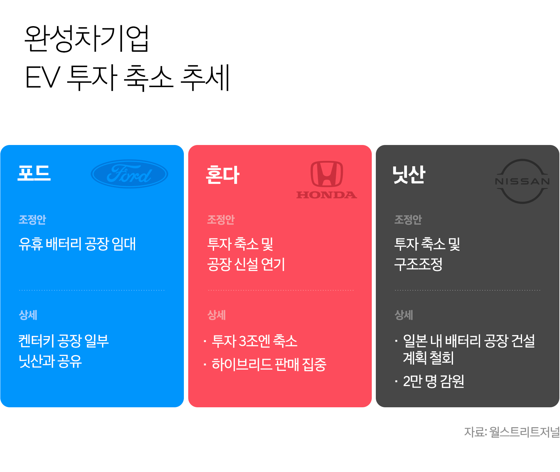 월스트리트저널에 따르면 닛산은 미국 공장 증설 계획 및 각종 투자를 연기 또는 철회하고 생존을 위한 대폭 전략 수정에 나섰습니다. 혼다역시 전기차 투자를 30% 축소하고, 2030년까지는 전환기에 더욱 유리한 하이브리드 판매에 집중하겠다고 밝혔습니다.