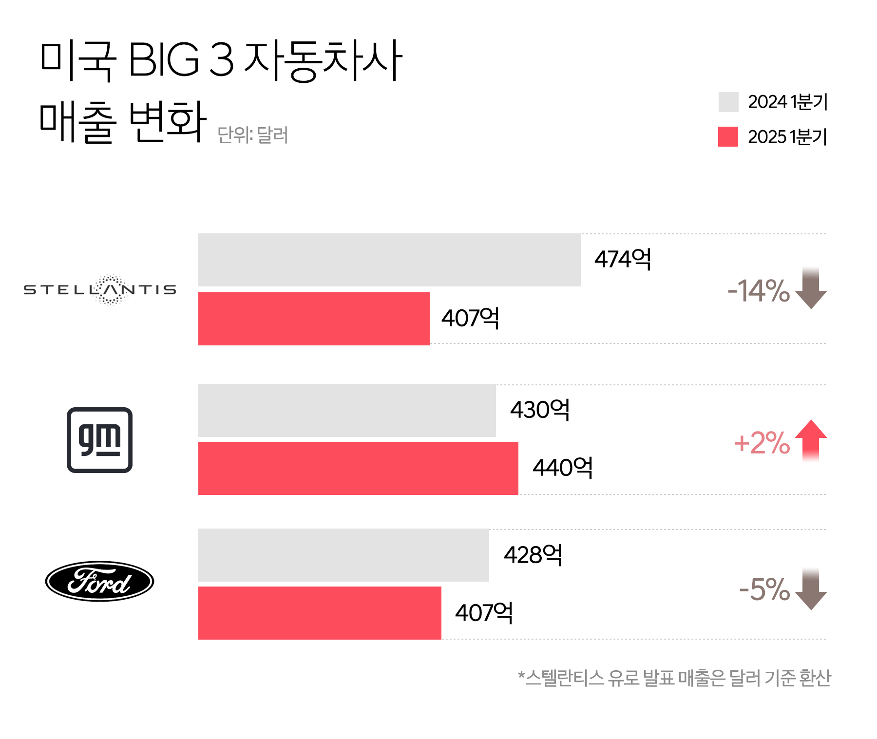 미국 자동차 빅 3는 나란히 부진한 실적을 기록했습니다. 각 사에 따르면, 포드는 1분기 순이익이 전년 대비 64% 급감한 4억 7,100만 달러(약 6,600억 원)를 기록했습니다. 매출도 5% 줄어든 가운데, 관세에 따른 부담이 연간 약 15억 달러에 이를 것으로 전망하고 있습니다. GM 역시 6.6% 줄어든 28억 달러의 순이익을 기록했으며, 최대 50억 달러에 달하는 추가 비용이 발생할 수 있다고 밝혔습니다. 스텔란티스는 북미 지역 판매량이 20% 감소하며, 전년 대비 14% 줄어든 358억 유로(약 57조 원)의 매출을 기록했습니다.