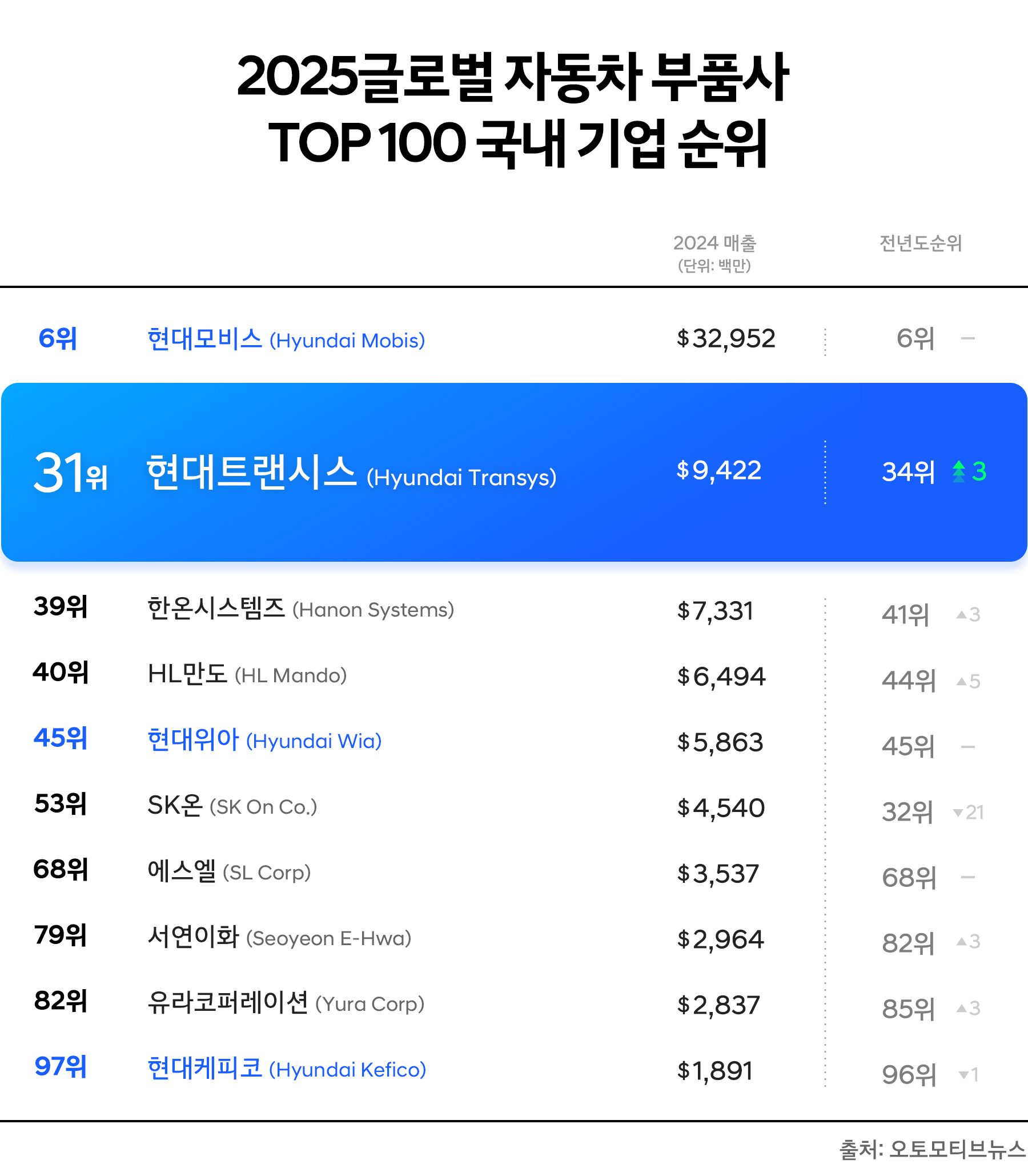 현대자동차그룹의 핵심 부품 계열사인 현대트랜시스는 2024년 매출 9,422백만 달러(약 12조 원)로 전년보다 3계단 상승한 31위에 올랐습니다. 출범 5주년을 맞이했던 지난해 기준으로 매출과 순위 모두 상승했습니다. 또한, 현대트랜시스의 이번 성과는 2023년 35위, 2024년 34위, 2025년 31위로 이어지는 3년 연속 순위 상승으로, 어려운 시장 환경 속에서 이뤄낸 의미 있는 결과입니다.