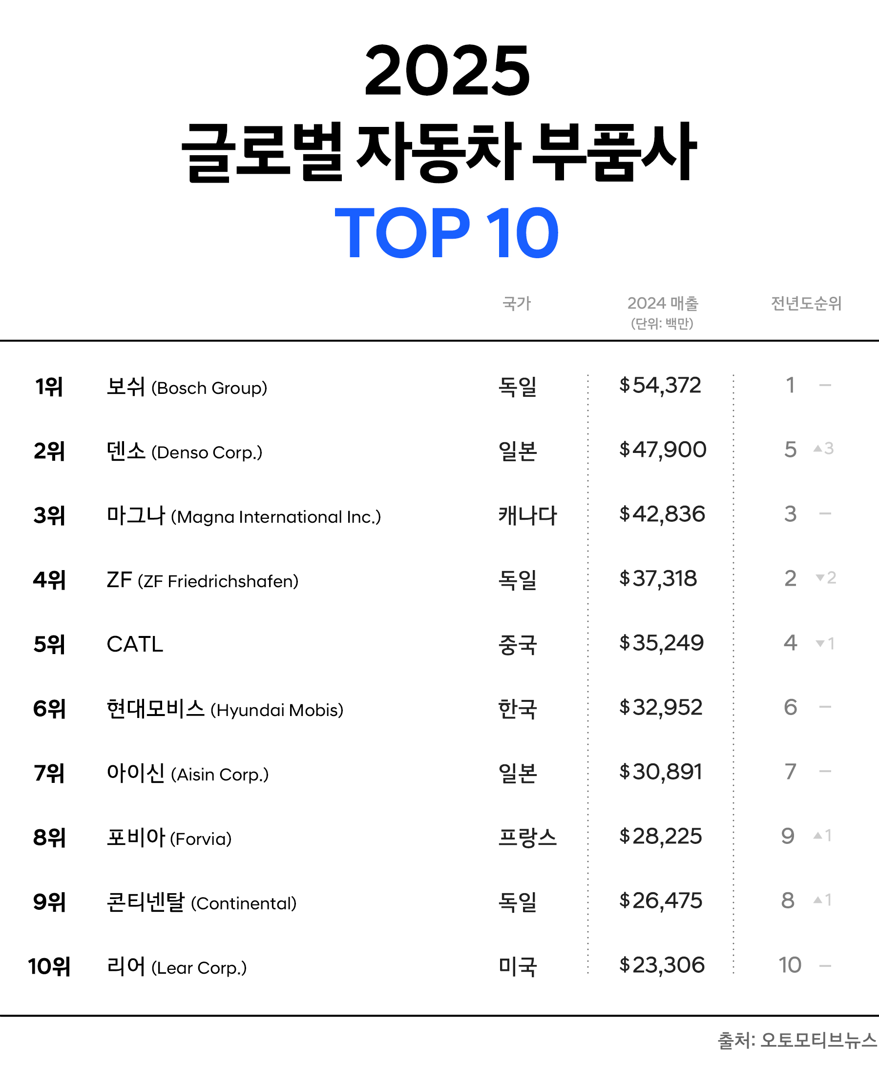눈에 띄는 변화는 2위인 일본 덴소입니다. 전년도 5위에서 3계단 상승했으며, 매출도 479억 달러로 소폭 증가했습니다. 전기차용 인버터와 열 관리 시스템 등 전동화 부품의 수요 증가에 따라 매출이 확대됐고, 반도체 수급 안정화로 생산 효율 또한 개선되면서 순위 상승에 긍정적으로 작용했습니다.
