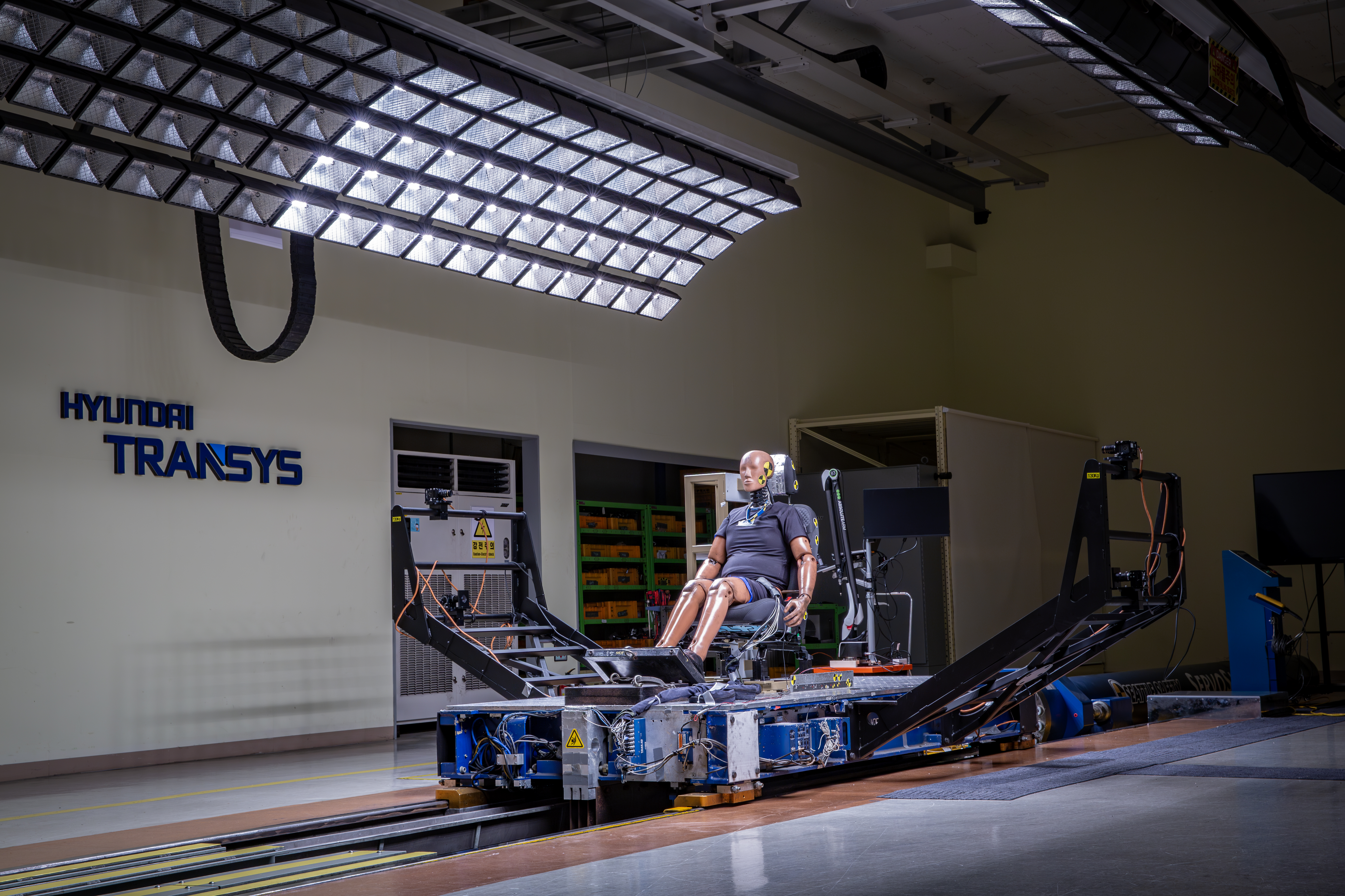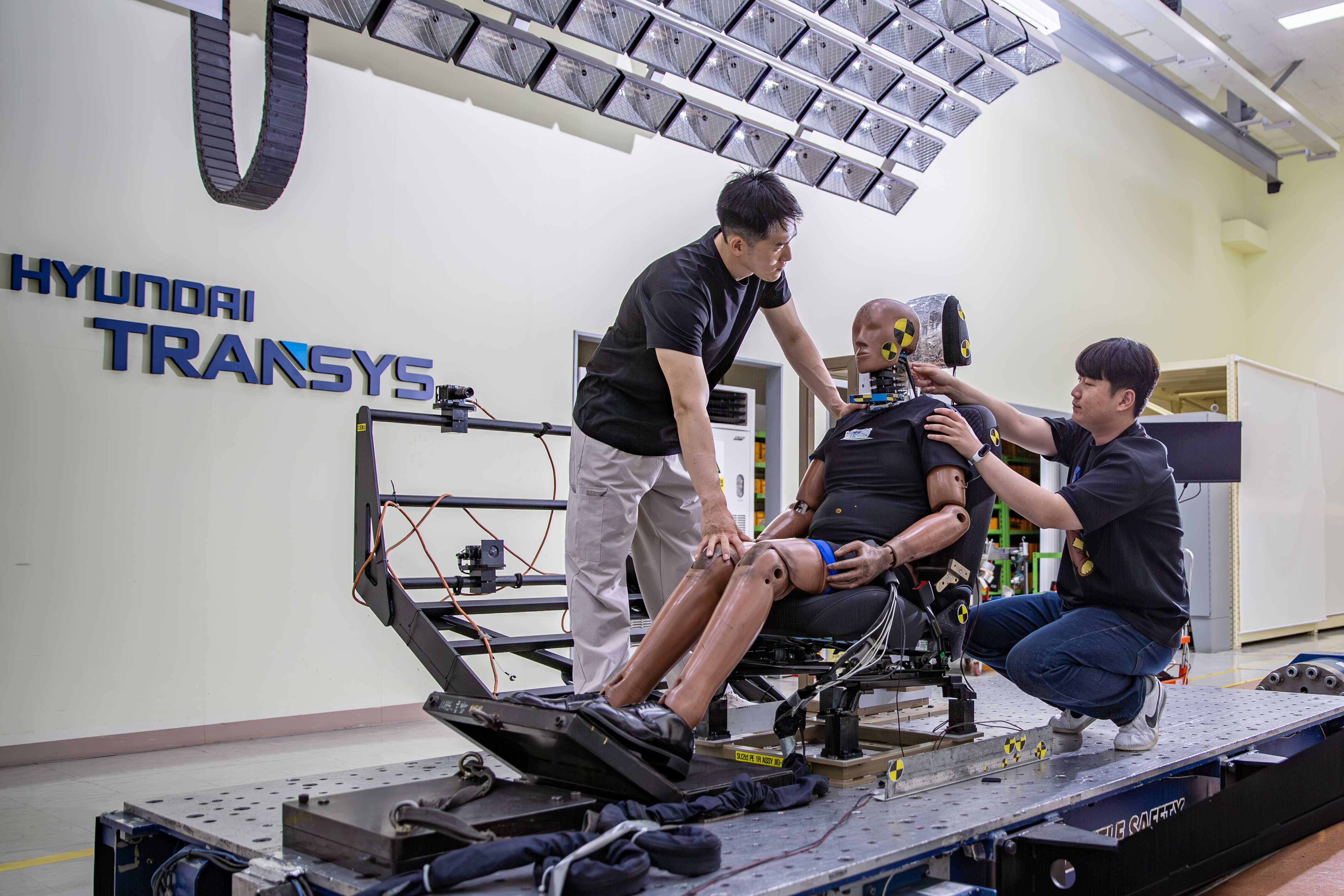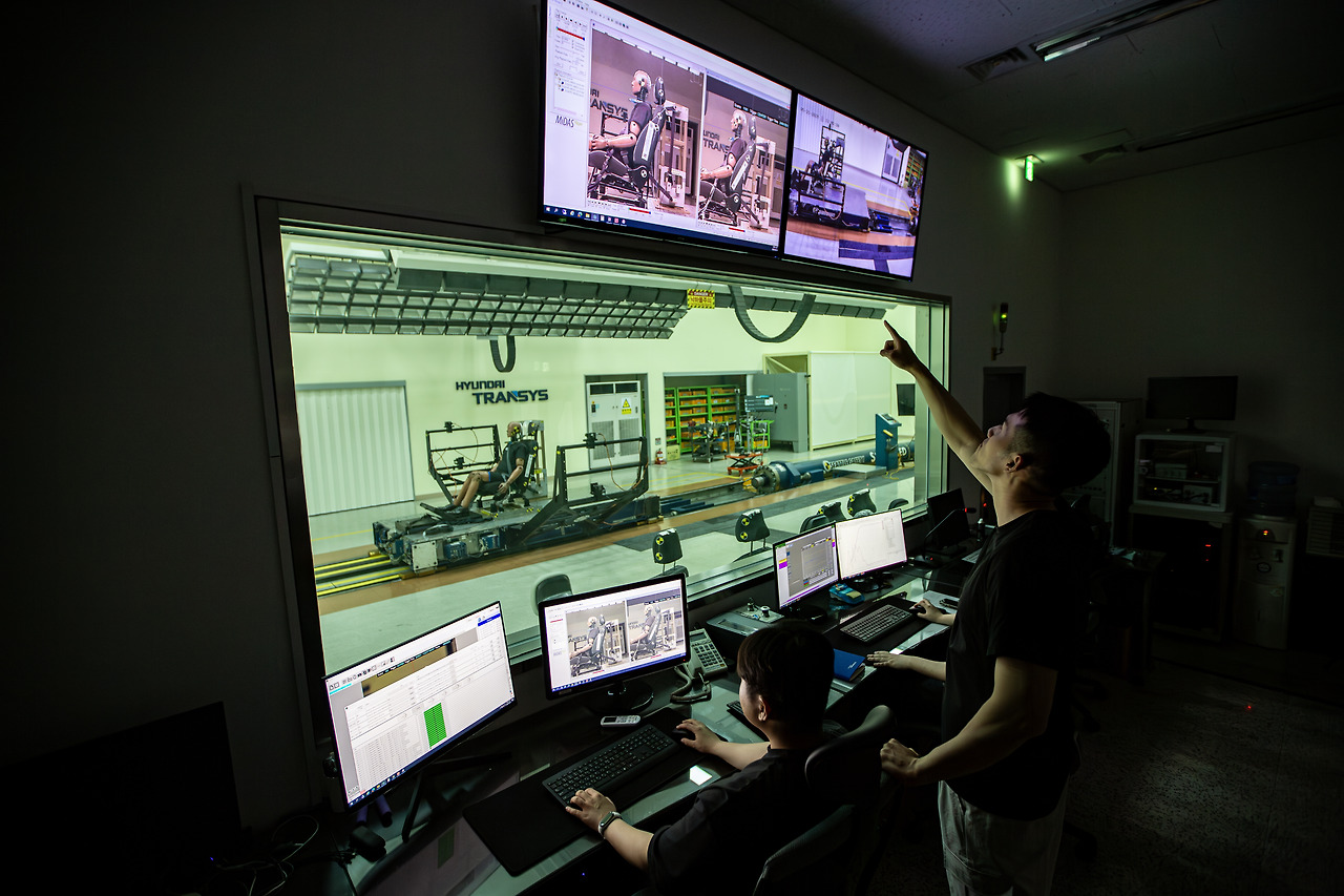 실제 도로 주행에서 발생할 수 있는 충돌을 정밀하게 재현하는 대표적인 실험입니다. 충돌 상황을 가상으로 구현하는 슬레드 장비에 시트를 고정한 후 인체 모형인 더미dummy를 앉혀 테스트합니다. 전방 및 후방 충돌 시 목과 허리의 움직임, 시트의 변형 여부, 안전벨트 및 에어백 작동 타이밍 등을 종합적으로 분석합니다.