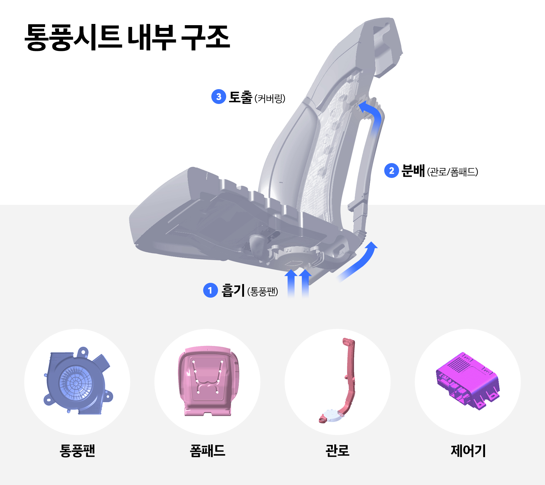송풍식 통풍 시트의 내부 구조를 살펴보면 시트 내부에 바람을 불어넣는 통풍 팬, 통풍 팬에서 만들어낸 바람이 이동하는 통로인 관로, 관로에서 나온 바람이 통과하면서 시트 쿠션 역할을 하는 폼 패드, 통풍 팬이 만들어내는 바람의 양을 조절하는 제어기 등으로 이루어져 있습니다. 폼 패드를 통과한 바람은 시트 표면에 난 미세한 구멍을 통해 시트에 앉은 사람의 몸이 닿는 부분으로 전달됩니다.